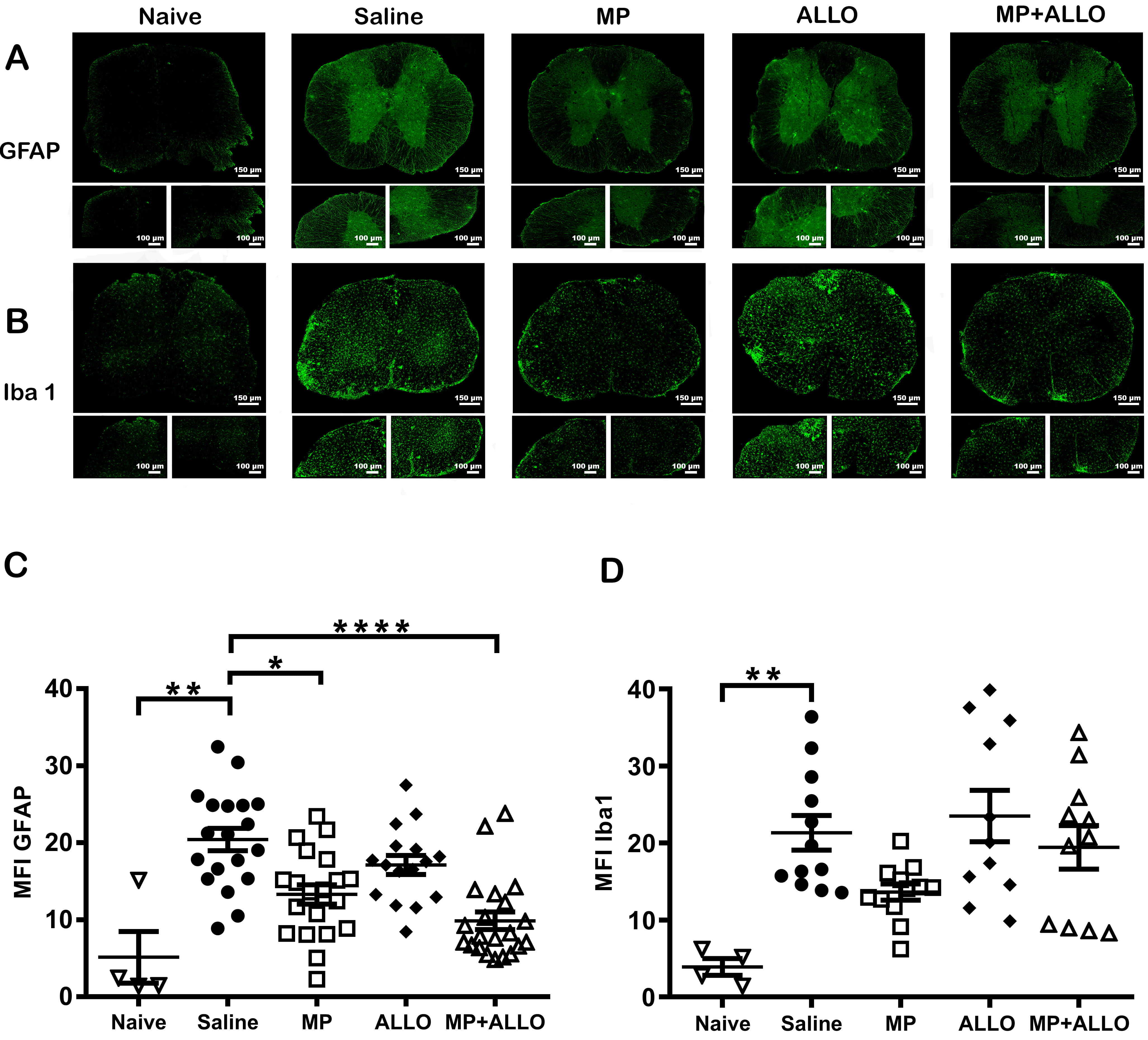 The expression levels of GFAP and Iba1 in astrocytes and microglia, respectively, are considered indicators of glial activation. As shown in Fig. 3, treatment with MP and MP+ALLO significantly reduced the MFI values of GFAP compared to saline-treated mice. Iba1 expression was significantly reduced only in MP-treated animals.