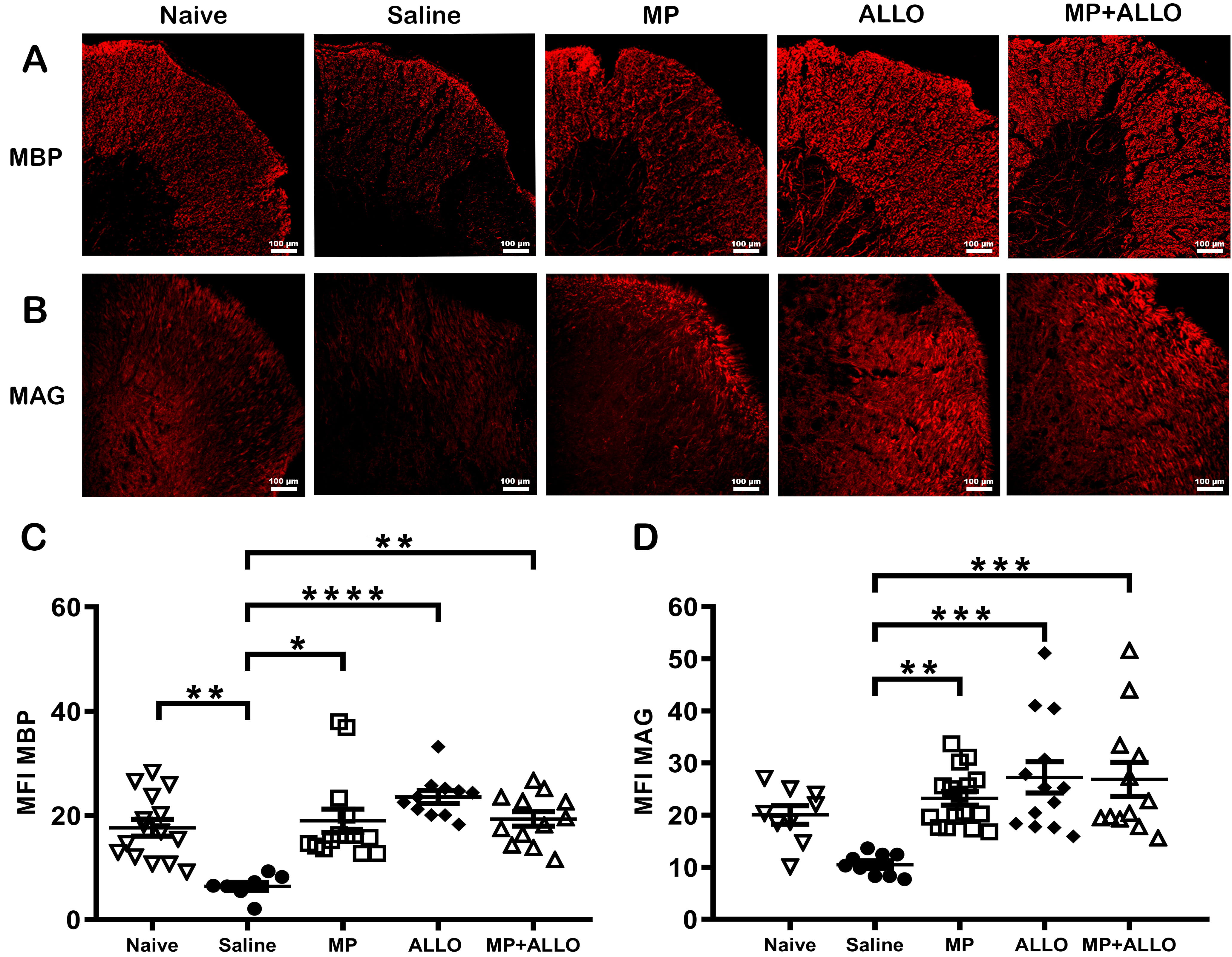 (C,D) MFI of MBP and MAG expression in spinal cord sections in