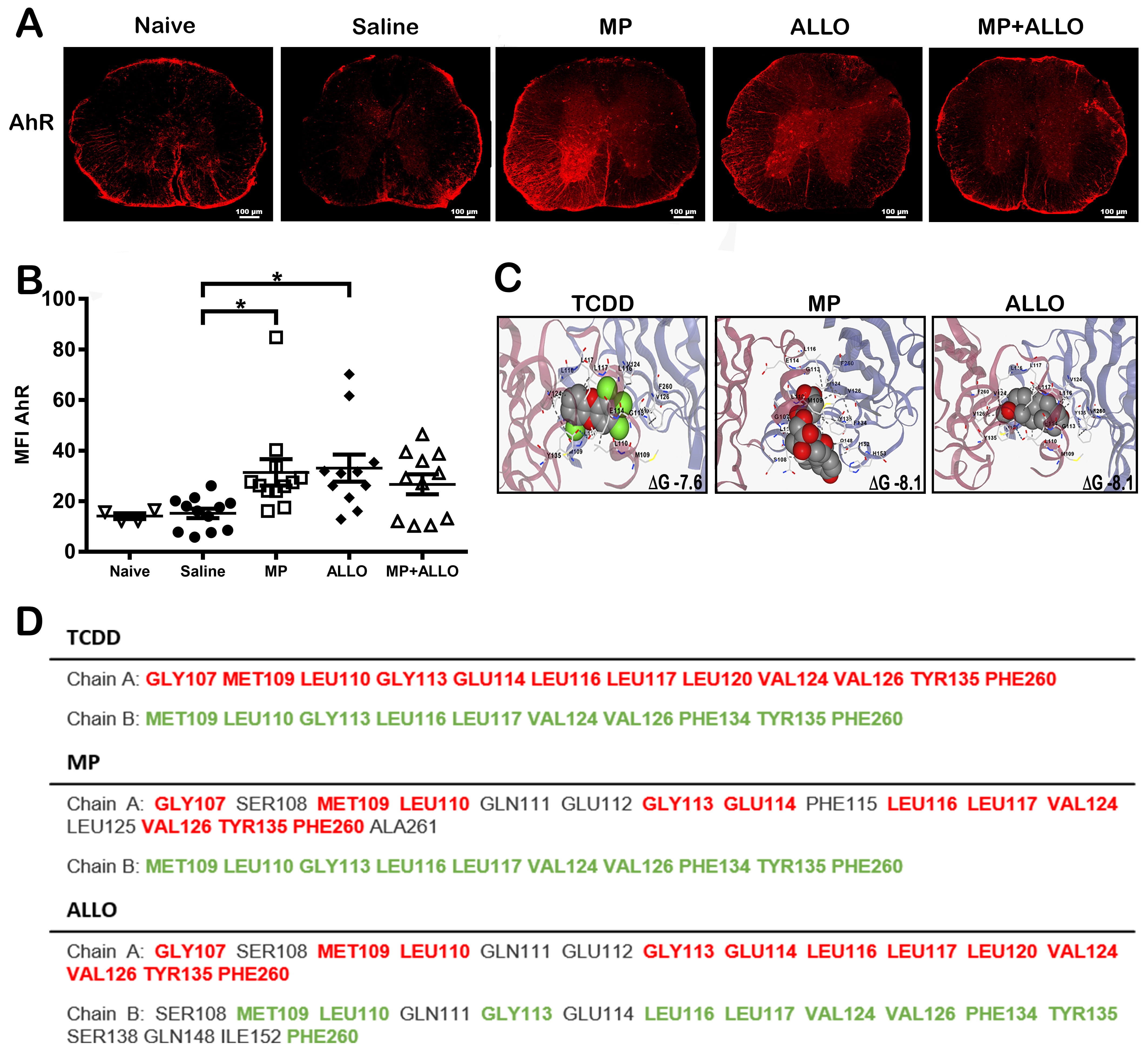 To evaluate if differences in decreasing severity by the two steroids tested, the possible participation of the level of receptors expressed was evaluated. As shown in Fig. 5A,B, both MP and ALLO increase the expression of AhR to a similar extend, a receptor involved in myelinization and the regulation of inflammation. This increase could be resulted by interaction of MP and ALLO with this receptor, a feature supported by the theoretical predictions when both drugs are structurally compared with 2,3,7,8-Tetrachlorodibenzo-p-dioxin (TCDD), also known as dioxin, that is a potent agonist of AhR (Fig. 5C,D).