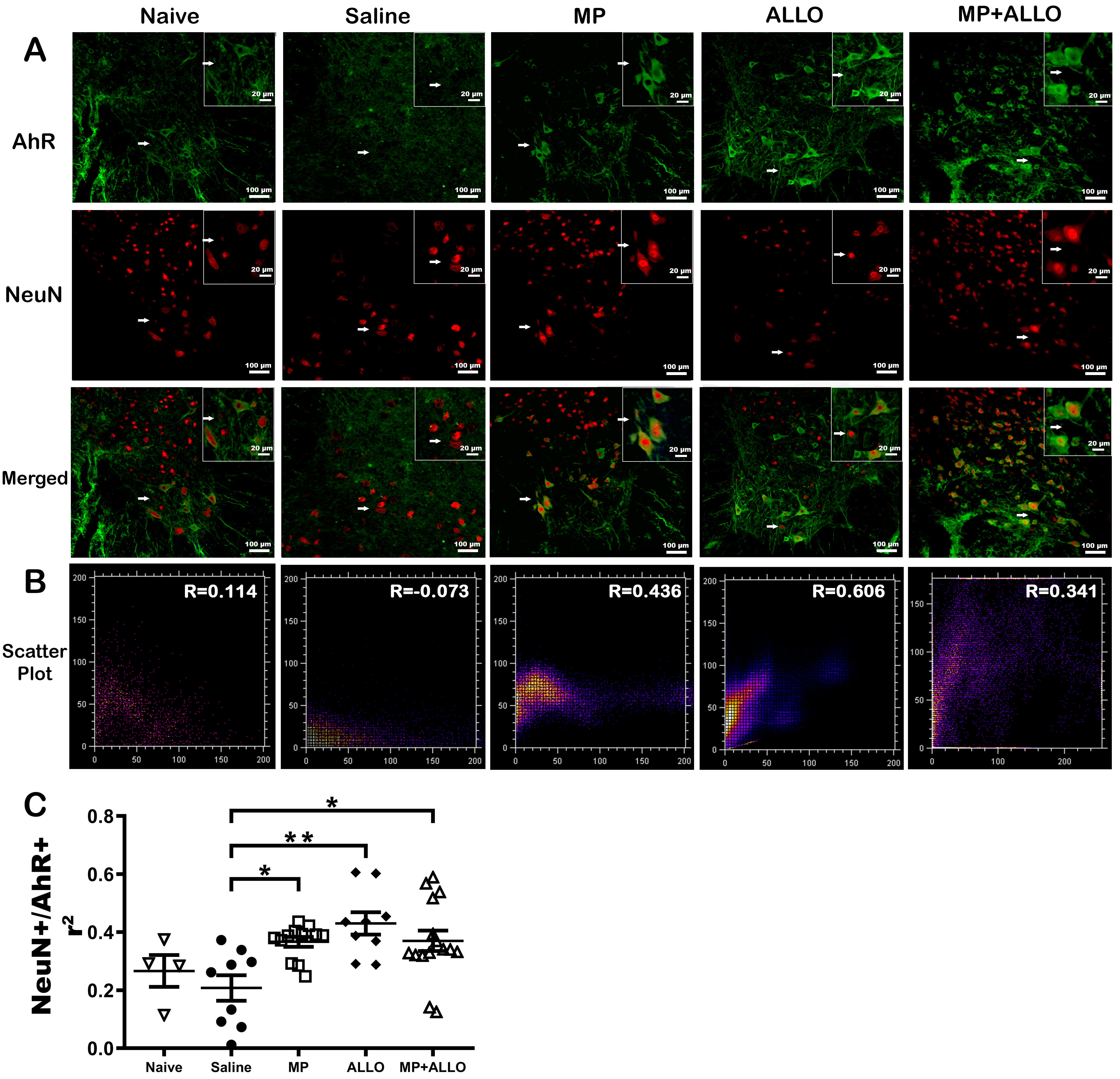 µm respectively. (B) Scatter plot of AhR and NeuN colocalization. (C)