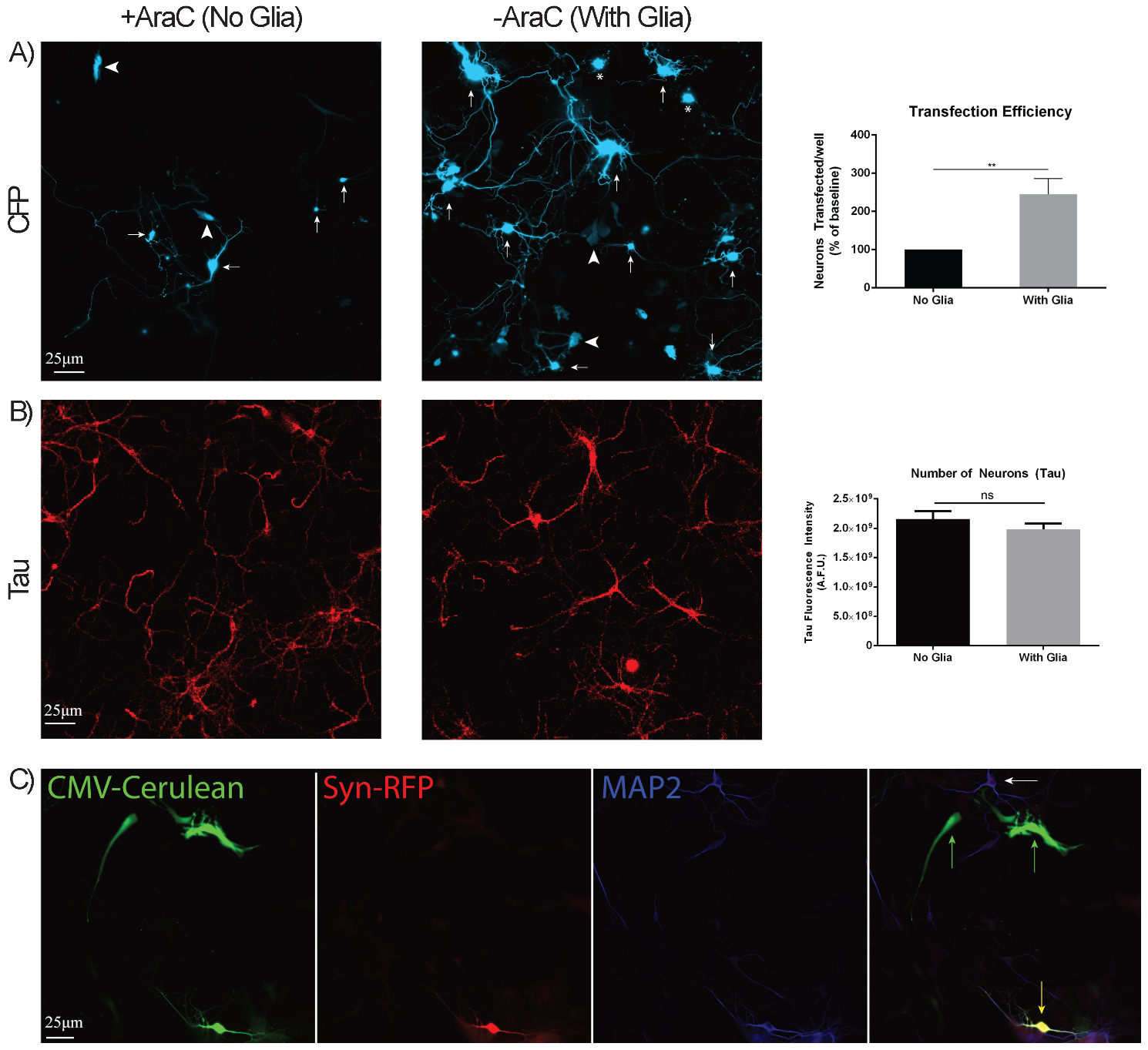 To accomplish this study, we needed to significantly improve the transfection efficiency since this was the rate-limiting step in our efforts to image RNAs with MS2 in primary hippocampal neurons. We co-transfected CFP (driven by cytomegalovirus (CMV) promoter) with MS2-RNA as a marker for transfected cells and tested several transfection protocols. To our surprise, the greatest factor improving transfection of neurons was the presence of dividing glia, as the omission of the routine primary neuronal additive cytosine arabinoside (AraC, to prevent glial proliferation) yielded ~3-fold higher transfection rates (Fig. 1A). This was in the presence of a similar density of neurons as demonstrated by Tau staining (Fig. 1B). Given the abundance of transfected glial cells, we developed plasmids that carry the Synapsin promoter to drive the expression of fluorescent proteins exclusively in neurons but not glial cells (Fig. 1C).
