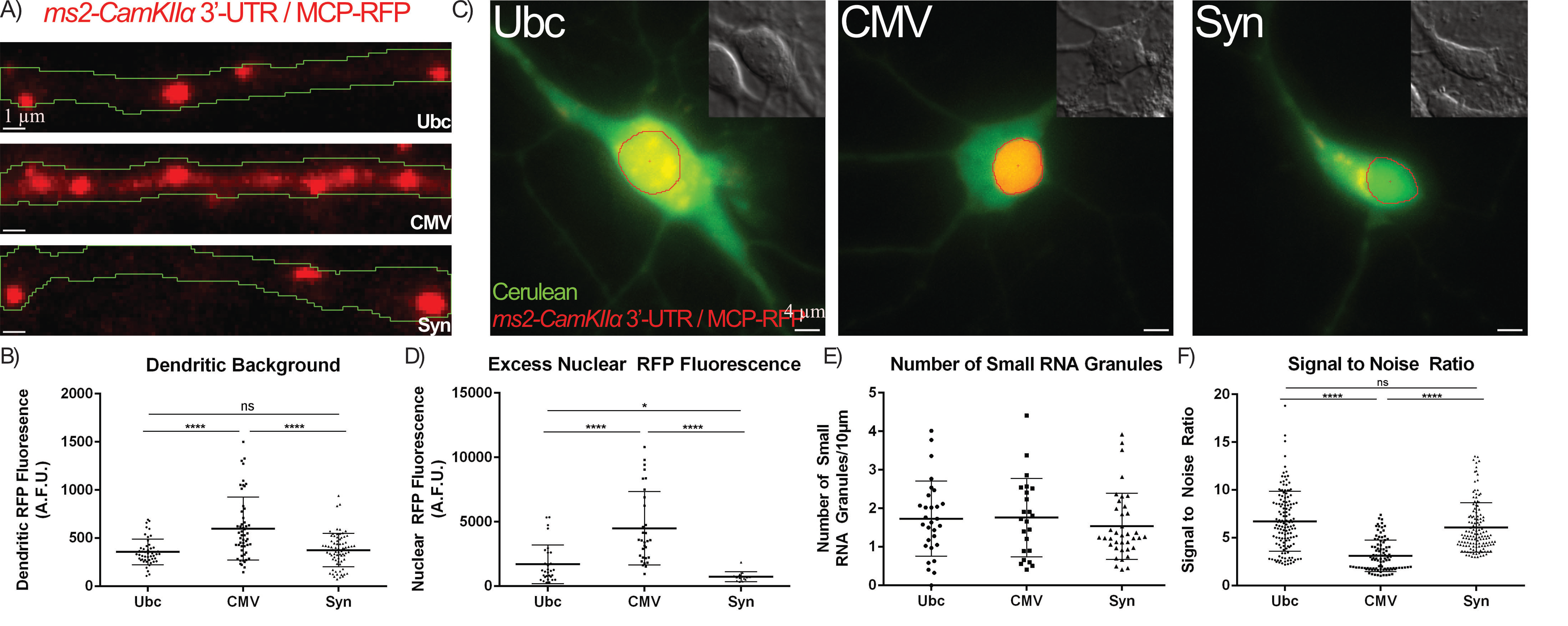 Firstly, we compared the different ratios of MCP-RFP (red fluorescent protein):MS2-RNA using an established dendritic mRNA 3′ UTR reporter,