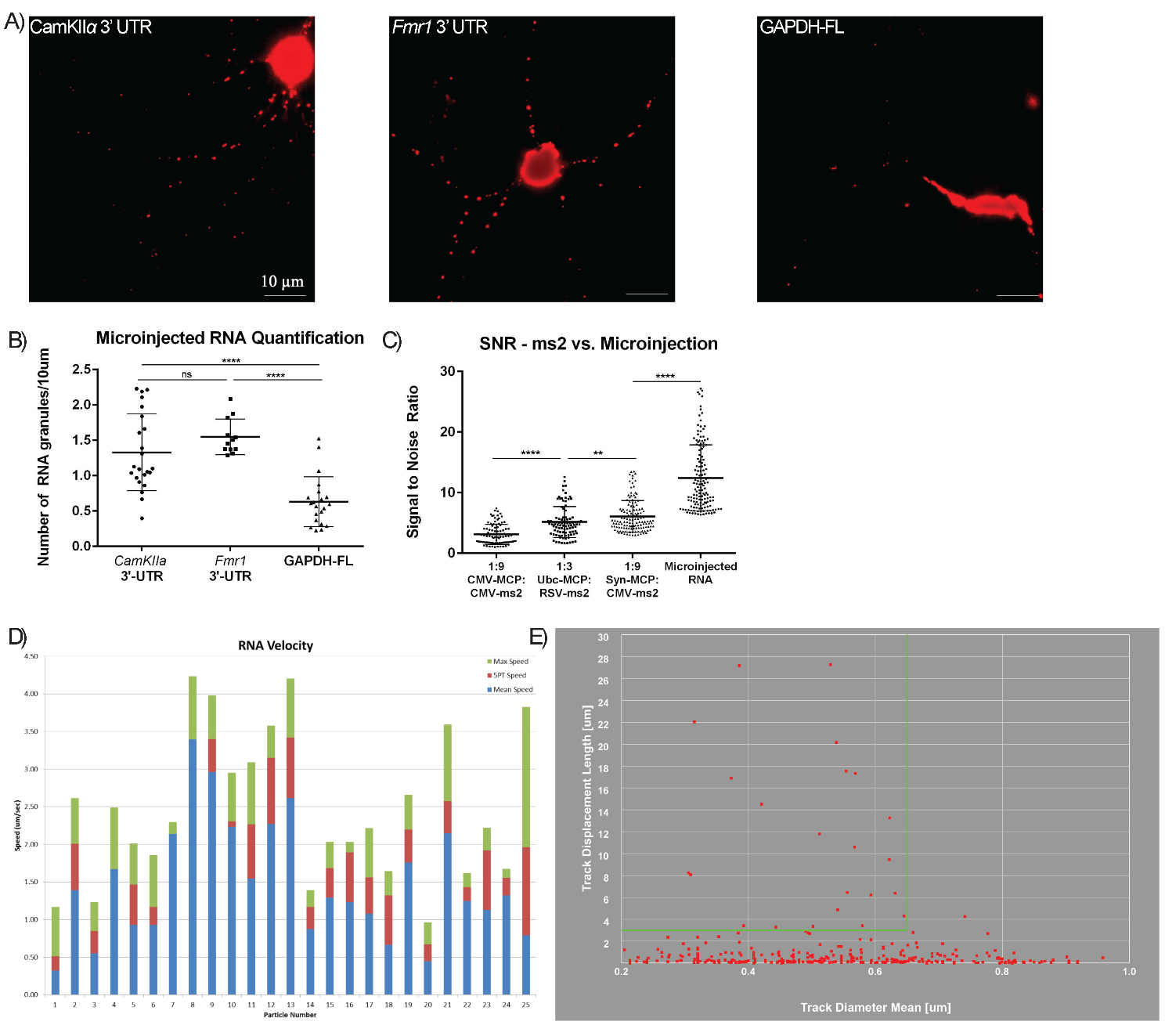 Dendritic mRNA localization is a key aspect of synaptic plasticity, as it allows the rapid and site-specific delivery of proteins required for synaptic modulation. In this study, we have optimized existing methods to visualize dendritic mRNAs in live neurons, providing an important tool for the study of synaptic activity-dependent mRNA transport. We focused on MS2 and microinjection as they are the most commonly used methods to study mRNA transport in live cells. Our first trials with the MS2 system yielded very few transfected cells with very high fluorescent backgrounds and very few particles undergoing directed transport. To resolve these issues, we first optimized transfection conditions to yield more transfectants and then optimized the plasmids to increase MS2-RNA expression and decrease MCP-FP expression. We found that the presence of glial cells in neuronal cultures increased the transfection efficiency and that the Lipofectamine LTX transfection reagent was far superior to the commonly used Lipofectamine 2000 (data not shown). Further, increasing the ratio of MCP-FP:MS2-RNA from 1:3 to 1:9 yielded brighter RNA granules. Additionally, placing the MS2-RNA under a stronger CMV promoter and the MCP-FP under weaker promoters (Ubiquitin and the neuron-specific Synapsin promoter) also yielded granules with highly increased SNRs.