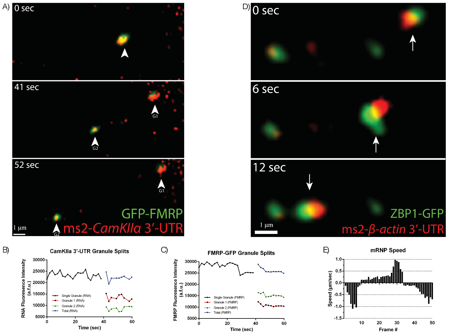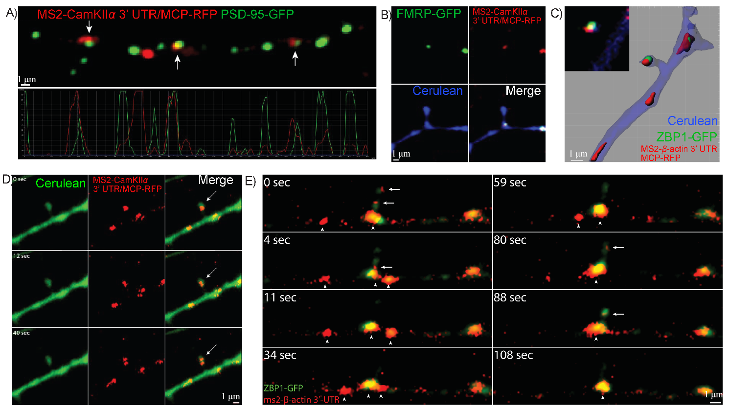 We found that the signal-to-noise ratio (SNR) of MS2-tagged mRNAs was greatly improved by maximizing the ratio of the MS2-RNA to MS2 coat protein-fluorescent protein (MCP-FP) constructs, as well as by the choice of promoter. Our observations also showed that directly fluorescently labeled mRNAs result in brighter granules compared to other methods. Importantly, we visualized the dynamic movement of co-labeled mRNA/protein complexes in dendrites and within dendritic spines. In addition, we observed the simultaneous movement of three distinct mRNAs within a single neuron. Surprisingly, we observed splitting of these complexes within dendritic spines.