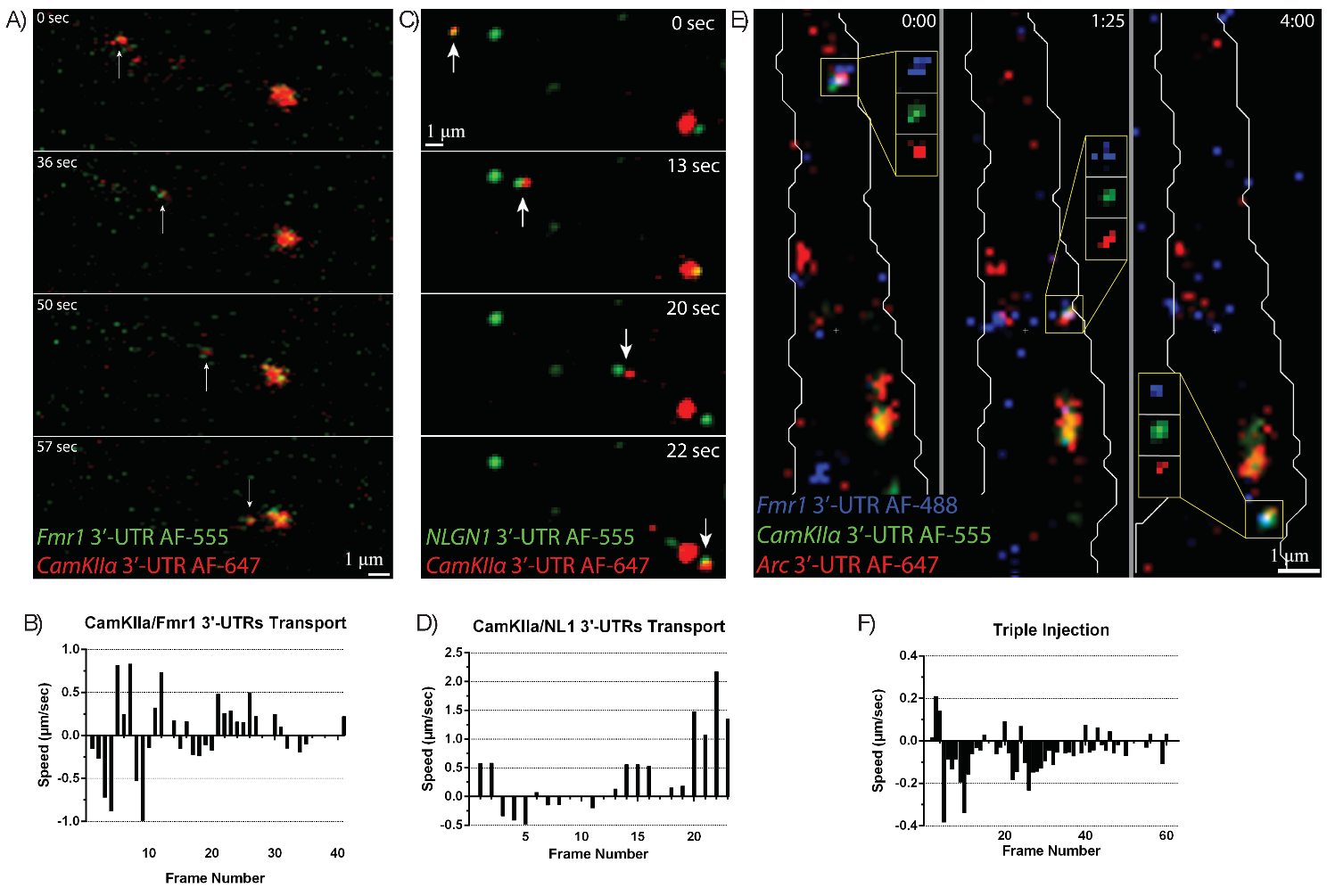 Several studies have suggested that mRNAs travel singly in dendrites (Batish et al. [22]). Approximately ~800 mRNAs have been identified in dendrites, suggesting that colocalization of dendritic mRNAs is higher than can be currently measured; our microinjection data showed up to three different synaptic plasticity-related mRNA species transporting together, showing that the dendritic machinery is capable of transporting at least up to three different mRNAs together. Further, new methods to study the transcriptome in-situ promise to provide genome-wide localization of RNAs in neurons [23, 24, 25]. These techniques will confirm whether different mRNAs travel alone or are co-transported together in dendrites.