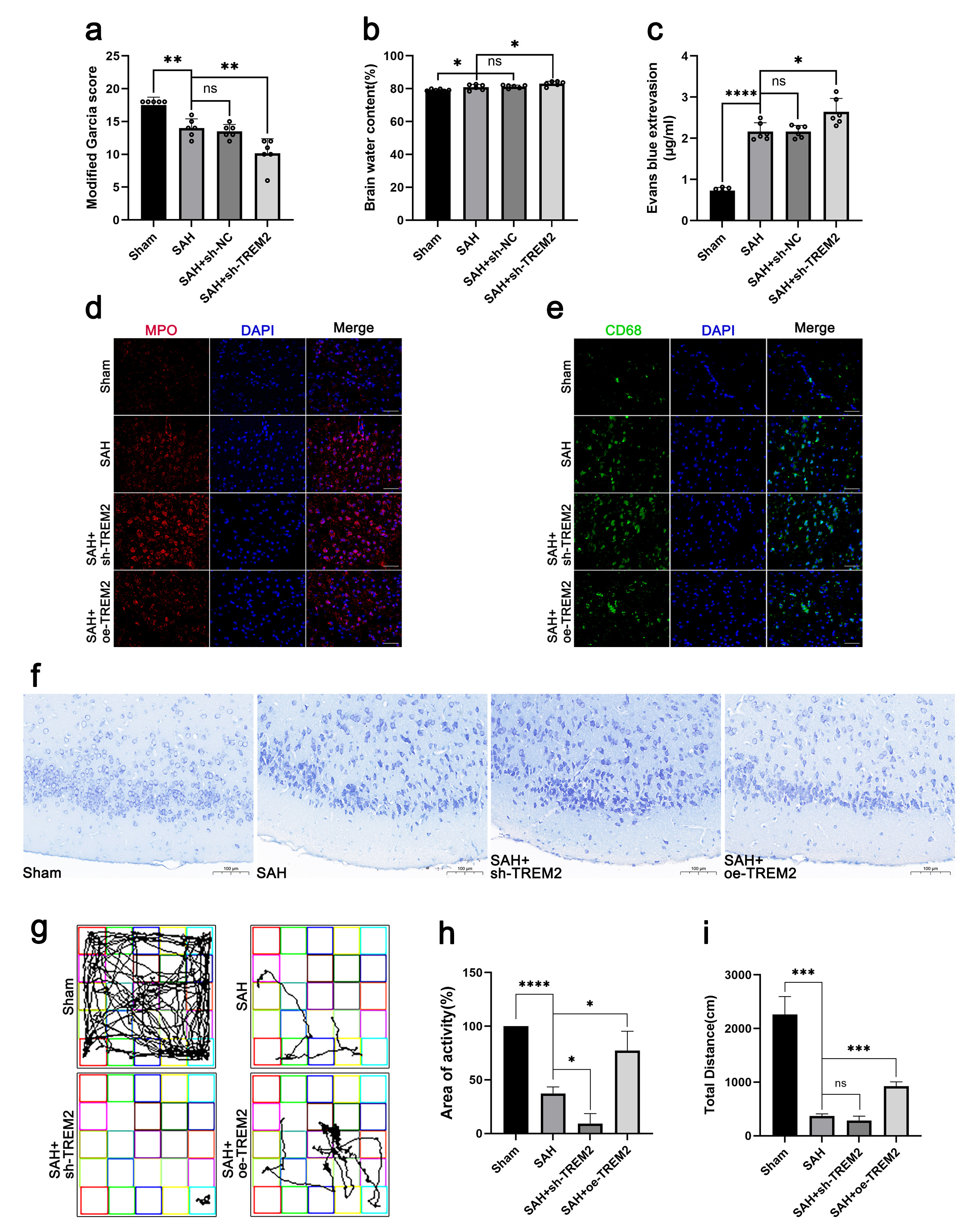 In the open field test (Fig. 2g–i), the SAH mice travelled significantly less than the sham mice, while the sh-TREM2 mice were shown to be less active than the SAH mice. However, the oe-TREM2 mice exhibited a better performance in the open field test, showing a greater total travelling distance and a higher activity compared to those of the SAH mice. Therefore, TREM2 was demonstrated to rescue the impaired neural function in the SAH mice.