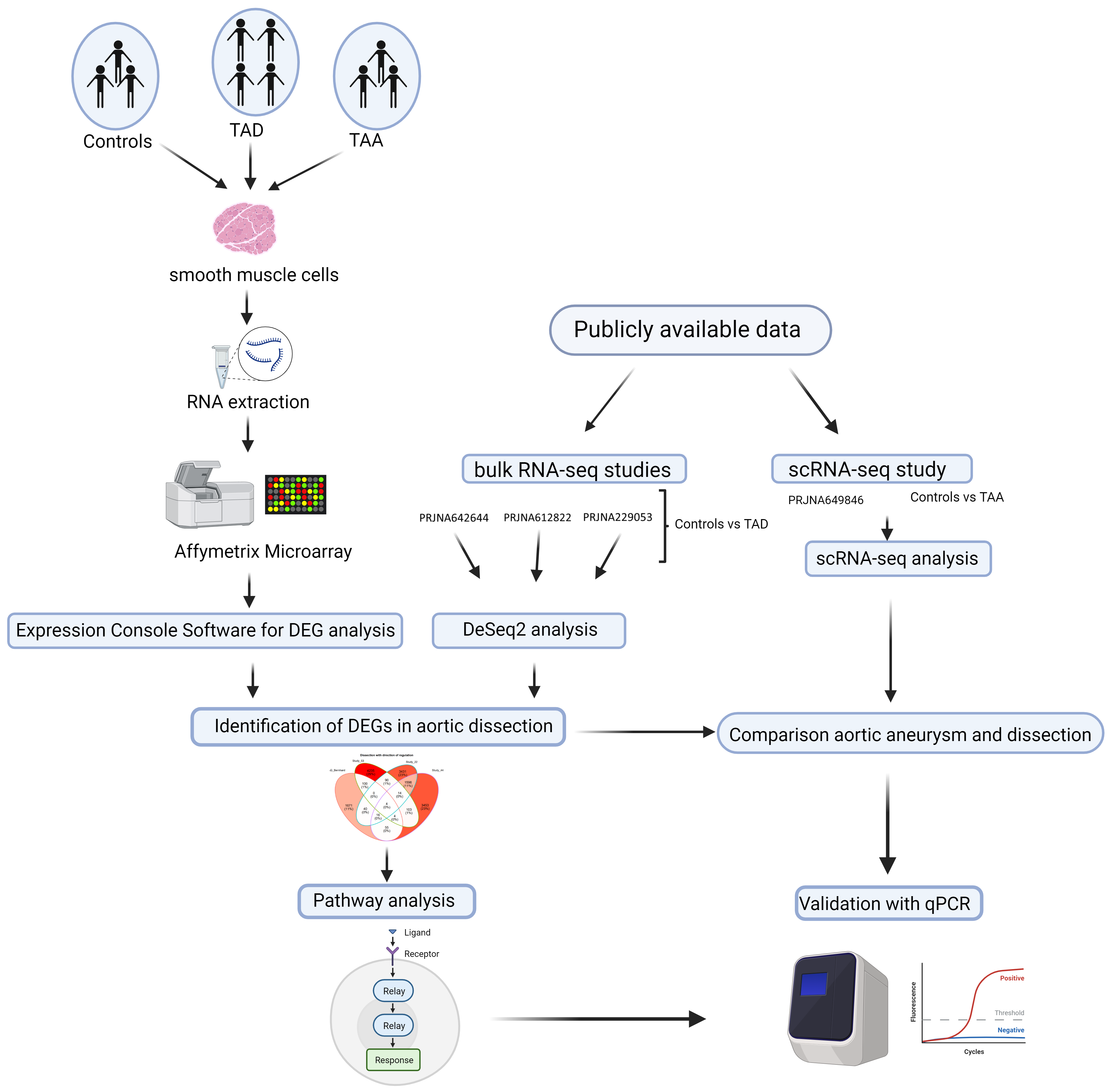 Fig. 1.Microarray and sequencing analysis workflow for TAD, TAA, and control samples. RNA was extracted from TAD (n = 4), TAA (n = 3), and control samples (n = 3). Samples were measured by Affymetrix Gene Chip and DEGs were analyzed by Affymetrix Gene Chip Operating Software. Parallel to microarray experiments, three publicly accessible bulk RNA-seq studies were analyzed with DeSeq2: PRJNA229053 (TAD n = 7, controls n = 5), PRJNA612822 (TAD n = 6, controls n = 6), and PRJNA642644 (TAD n = 10, controls n = 10). Common genes were identified by comparing the DEGs across the individual studies. A pathway analysis was performed and data was compared to Affymetrix Gene Chip Operating Software results (C vs TAA) and one publicly available scRNA-seq study PRJNA649846 (TAA n = 8, controls n = 3). Results were validated with RT-qPCR. TAD, thoracic aortic dissections; TAA, thoracic aortic aneurysms; DEGs, differentially expressed genes; C, control; scRNA-seq, single-cell RNA-sequencing; RT-qPCR, real-time quantitative polymerase chain reaction.