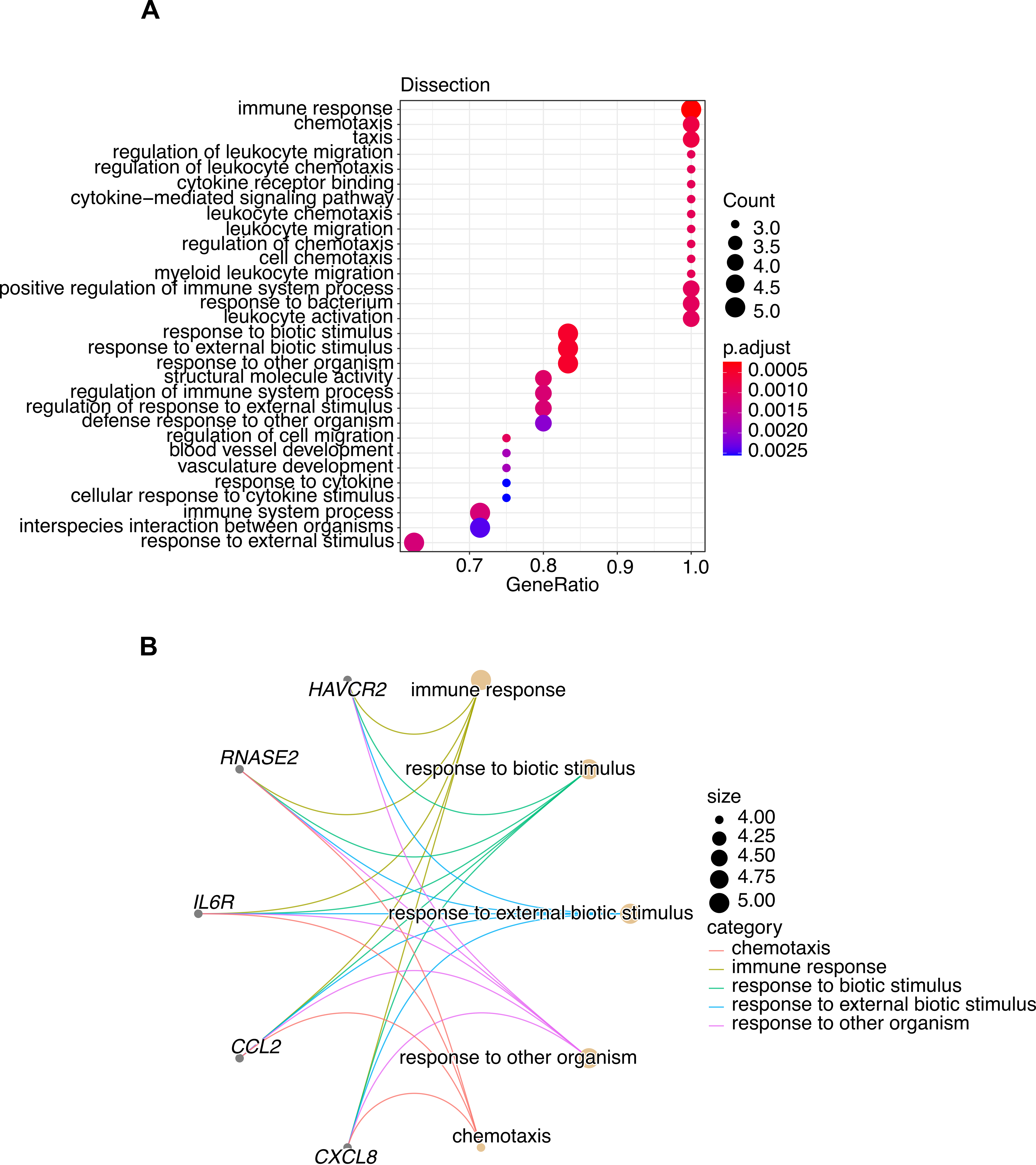 Fig. 3.Gene Ontology analysis argues for a central role of immune-related pathways in TAD pathogenesis. (A) Top 30 significantly affected biological processes, cellular components and molecular functions of 37 DEGs dysregulated in at least three TAD studies. The size of each dot reflects the quantity of impacted genes linked to the functional annotation (count). The Gene Ratio represents the ratio of affected gene counts to the size of the respective pathway. As for the dot color, it signifies the significance level: blue for lower significance and red for higher significance. (B) Netplot showing the molecular interaction/reaction network pathways of the five genes analyzed by gene ontology analysis. The dot size of the pathway indicates the number of the involved genes.