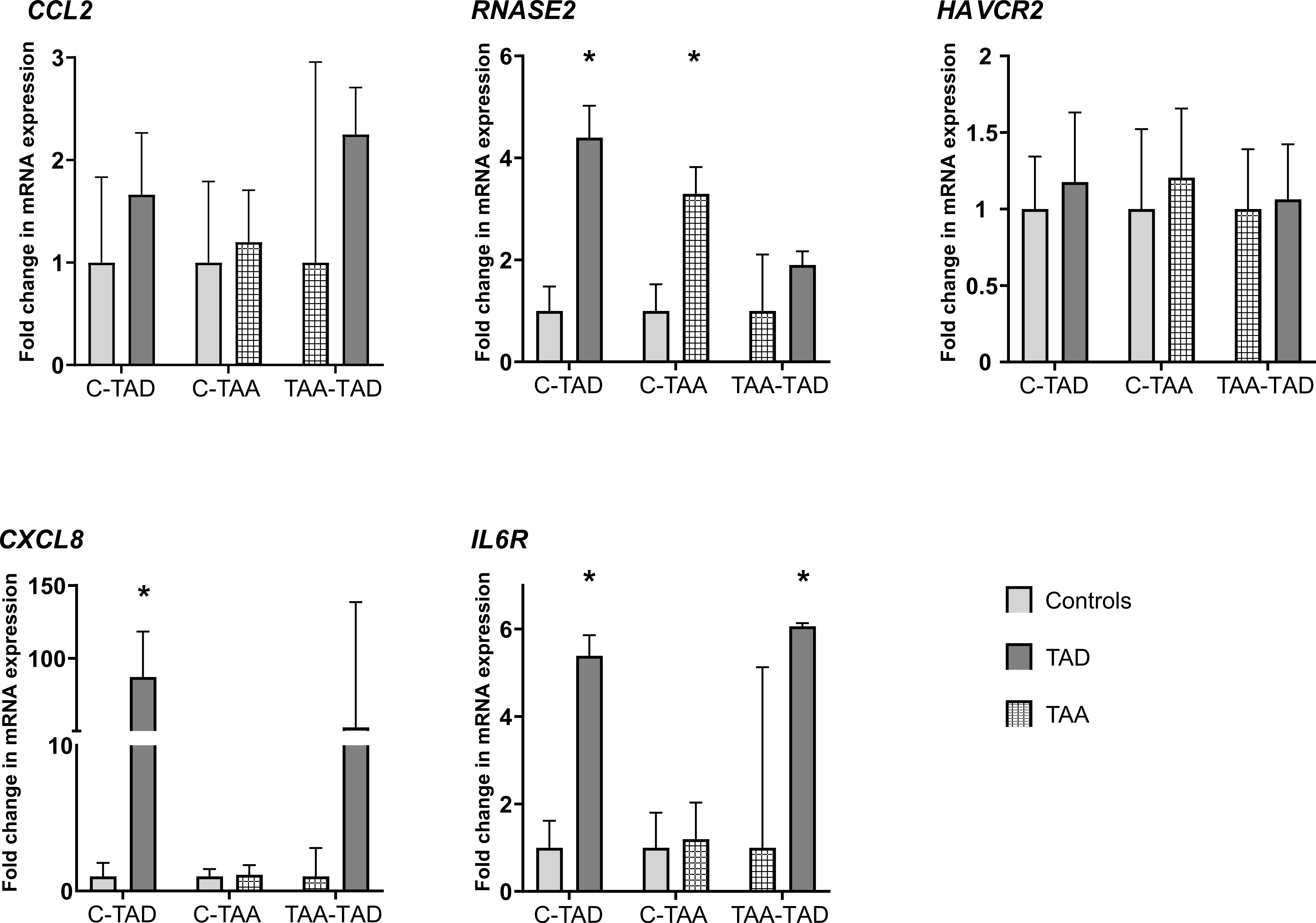 To validate the observed dysregulation of our fife selected candidate genes, we next performed RT-qPCR for CCL2, RNASE2, HAVCR2, CXCL8, and IL6R on primary aortic smooth muscle cells from TADs, TAAs, and controls.
