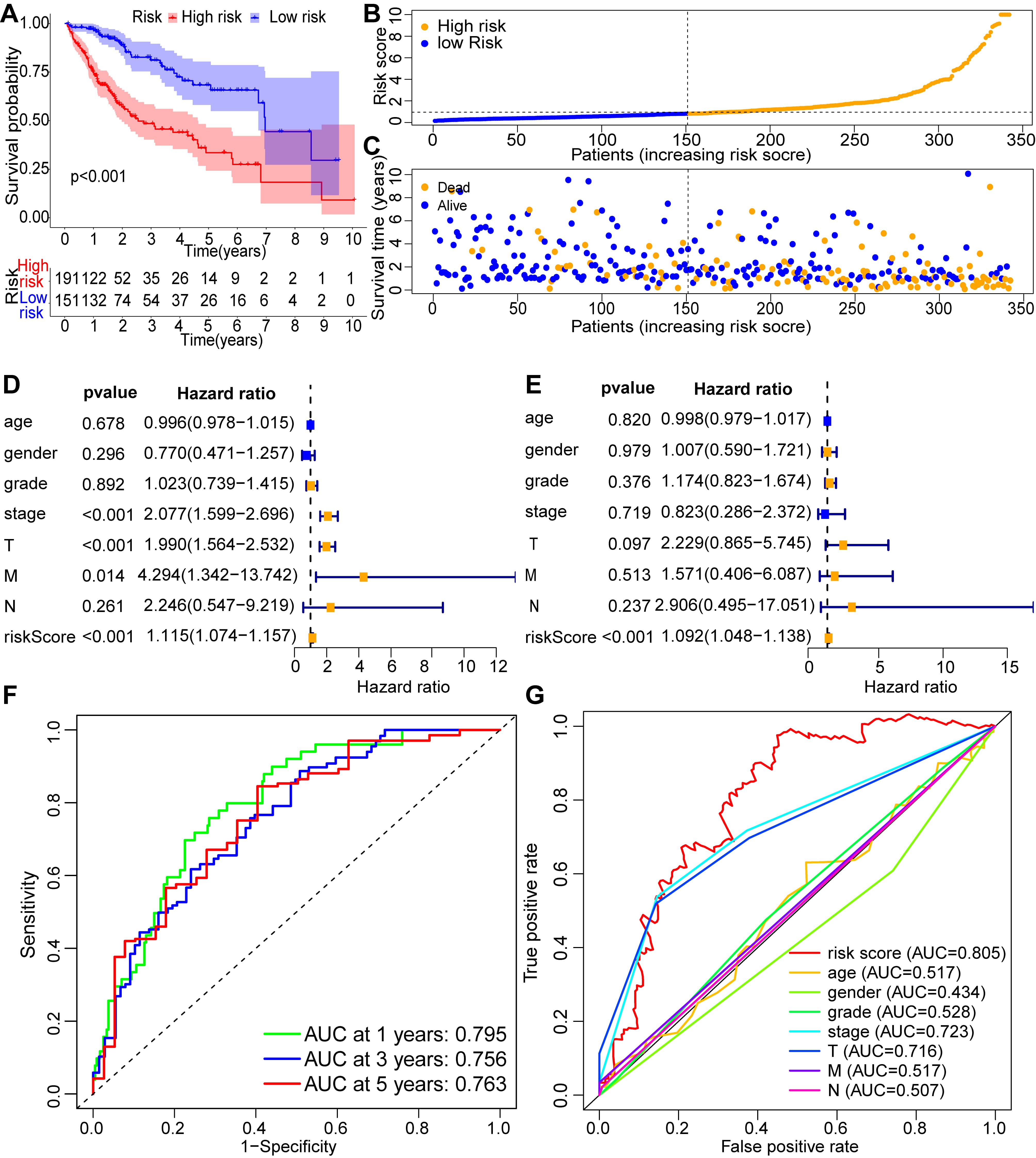 The results showed that the higher the risk score, the higher the T, M, grade,