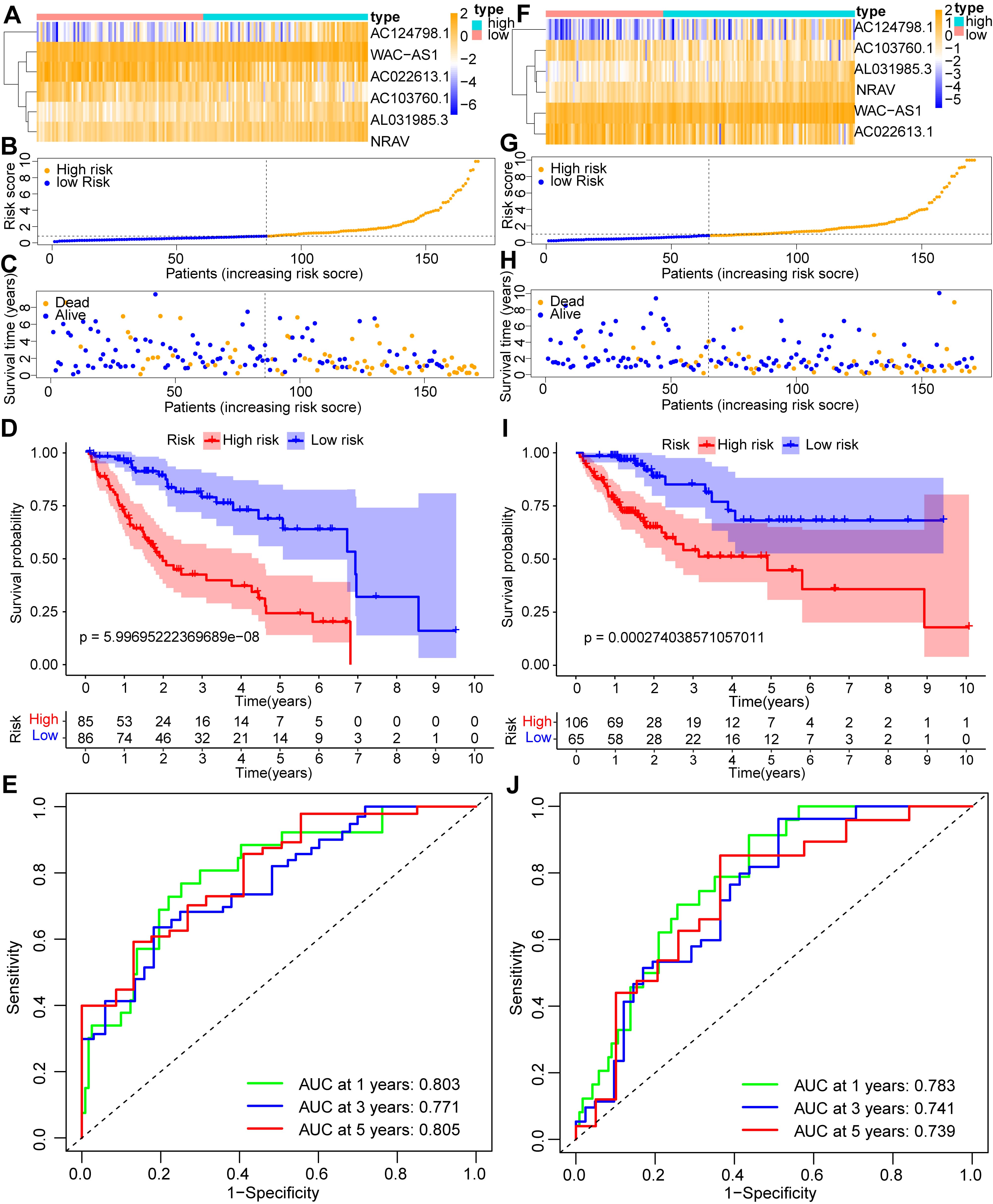 Fig. 5.Internal validation of the cholesterol metabolism-associated lncRNA prognostic signature. (A) Heatmap of the signature in the first internal cohort. (B) Distribution of the risk scores in patients with HCC in the first internal cohort. (C) The number of alive and dead HCC patients with various risk scores in the first internal cohort. (D) Kaplan-Meier (KM) analysis of OS rates in the first internal cohort. (E) ROC curve and AUCs at 1-year, 3-years and 5-years survival in the first internal cohort. (F) Heatmap of the signature in the second internal cohort. (G) Distribution of the risk scores in patients with HCC in the second internal cohort. (H) The number of alive and dead HCC patients with various risk scores in the second internal cohort. (I) KM analysis of OS rates in the second internal cohort. (J) ROC curve and AUCs at 1-year, 3-years and 5-years survival in the second internal cohort.