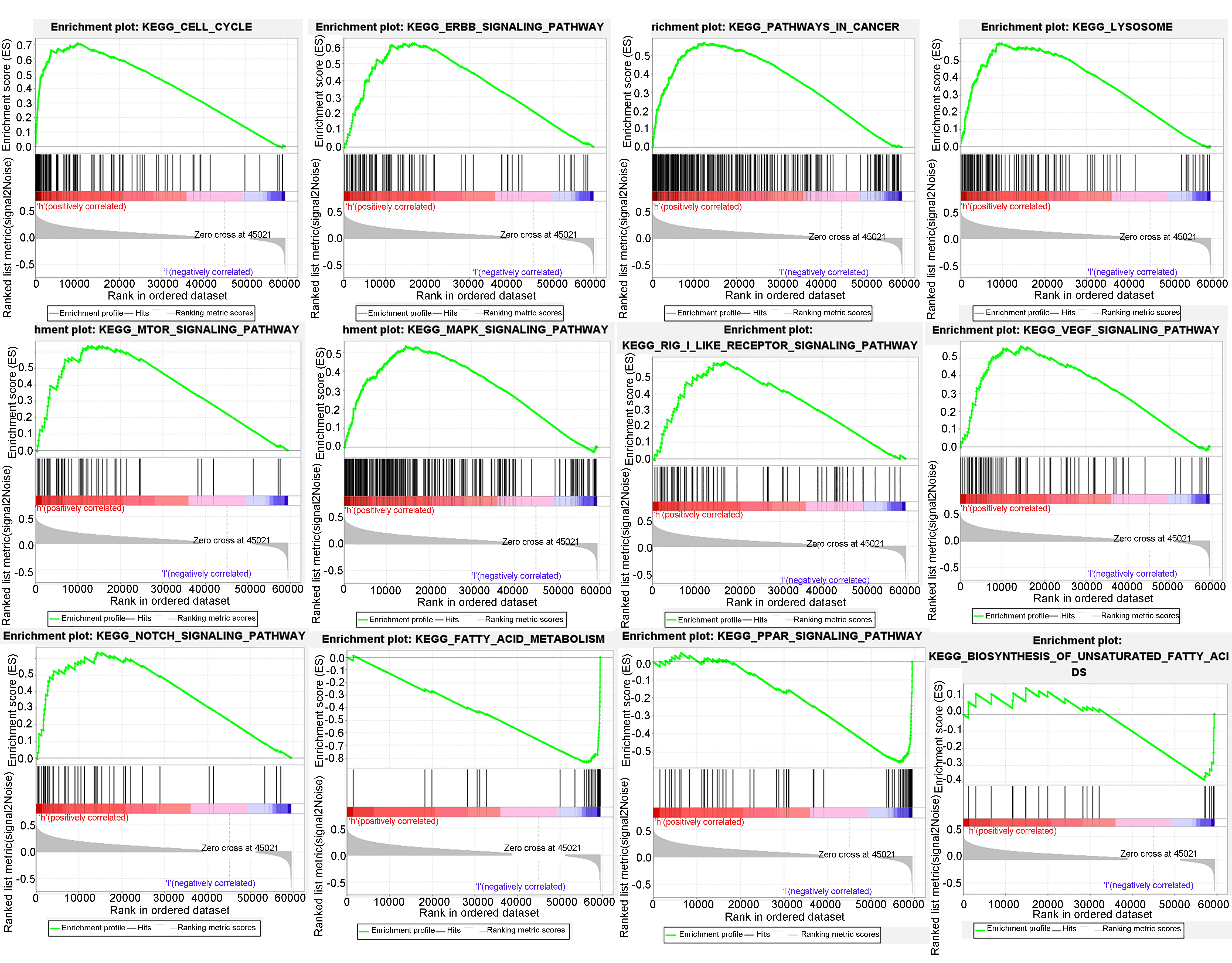 Fig. 6.Genomic enrichment analysis (GSEA) analysis of low- and high-risk groups of the cholesterol metabolism-associated lncRNA prognostic signature in HCC. This lncRNA prognostic signature is associated with cell cycle, ERBB pathway, pathways in cancer, lysosome, MTOR pathway, MAPK pathway, RIG_I like receptor pathway, VEGF pathway, notch pathway, fatty acid metabolism, PPAR pathway, and biosynthesis of unsaturated fatty acids.