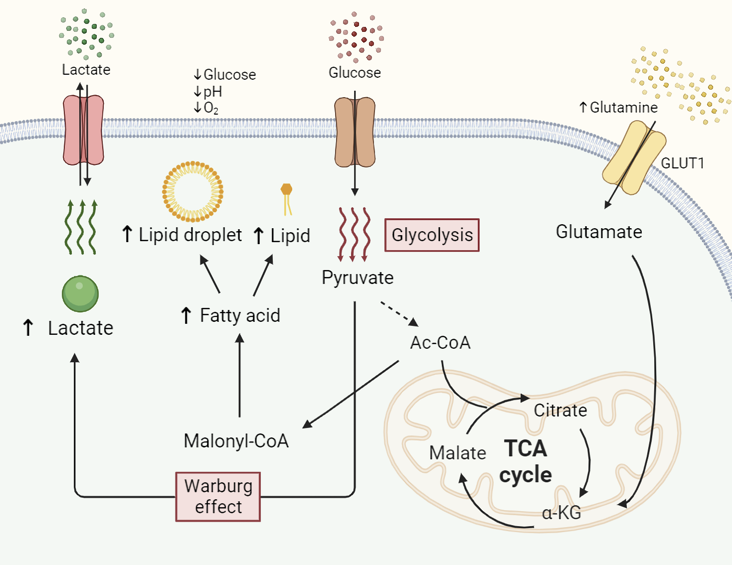 Glucose metabolism has been implicated in cancer development and metastasis and is the primary source of carbon chains for biosynthesis and energy metabolism [18]. In normal cells, glucose metabolism involves the synthesis of adenosine triphosphate (ATP) through anaerobic glycolysis and cellular respiration. However, glucose metabolism in cancer cells is aerobic and is regulated by epigenetic mechanisms and cooperation with the TME, which can lead to the loss of tumor suppressors [19, 20]. The rapid proliferation of cancer cells is facilitated by lactate production and glucose metabolism, which lead to cancer progression, chemoresistance, and local depletion of oxygen. This results in hypoxic regions containing high levels of lactate [21, 22, 23], which then restricts immune cell function by switching to an acidic environment [24]. Pancreatic cancers show upregulated expression of rate-limiting glycolytic enzymes including hexokinase 1/2 (HK1/2), phosphofructokinase 1 (PFK1), and lactate dehydrogenase A (LDHA, a subunit of LDH), thus contributing to the Warburg effect and improving lactate-mediated glycolysis [22].