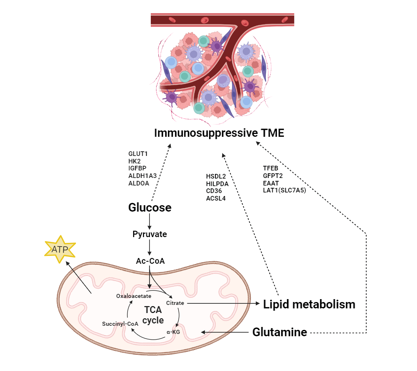 (TME) in pancreatic cancer. Glucose, glutamine, and lipid metabolism contribute