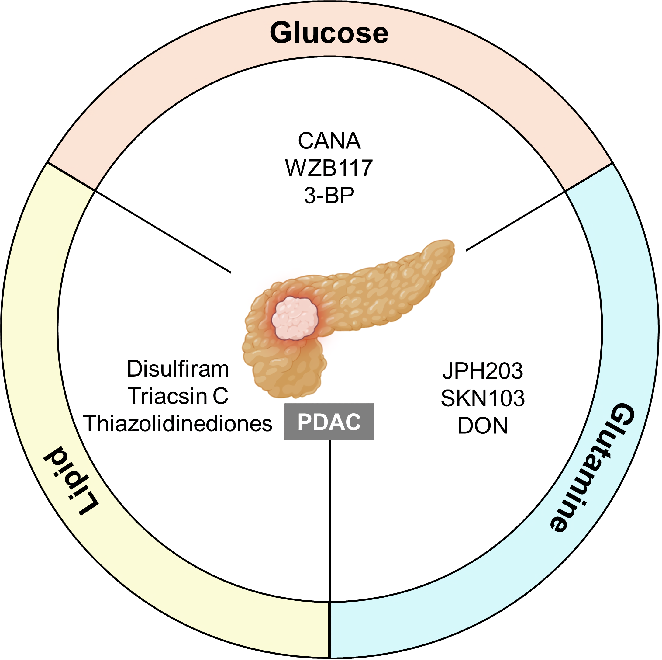 GLUT1, glucose transporter 1; CANA, canagliflozin; HK2, hexokinase 2; 3-BP, 3-bromopyruvate; ATP, adenosine triphosphate; LAT1, L-type amino acid transporter 1; PDAC, pancreatic ductal adenocarcinoma; DON, 6-diazo-5-oxo-L-norleucine; ALDH, aldehyde dehydrogenase; ACSL4, long chain acyl CoA synthetase 4; FAs, fatty acids; FDA, U.S. Food and Drug Administration.
