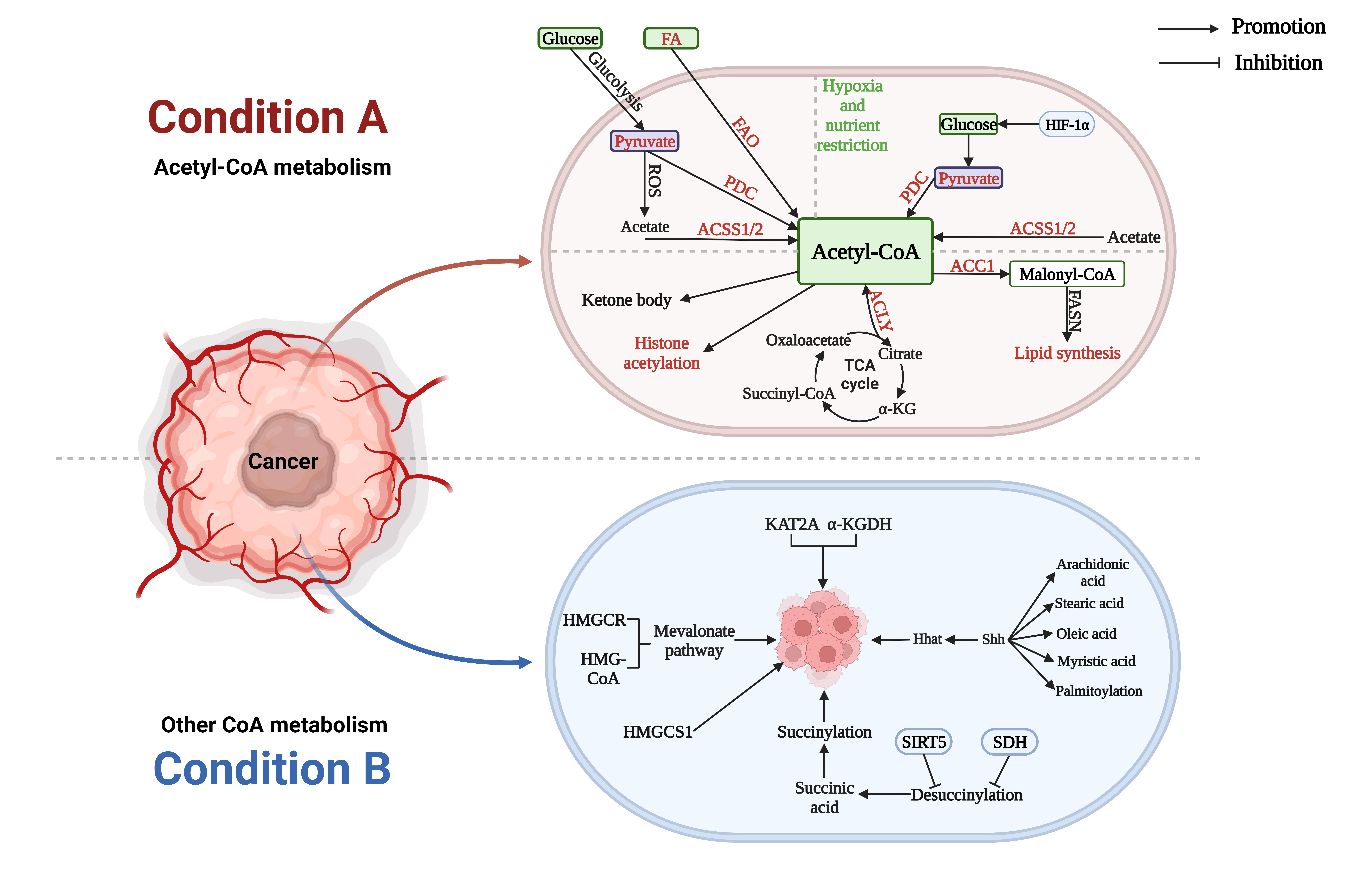 Fig. 1.Coenzyme A (CoA) and cancer. Condition A delineates acetyl-CoA metabolism in cancer, while condition B describes other CoA metabolism types in cancer. The solid arrow denotes the promotion process, whereas the blunt arrow signifies inhibition. The metabolism of acetyl-CoA in cancer is intricately regulated by acyl-CoA short chain synthetase (ACSS), ATP citrate lyase (ACLY), and acetyl-CoA carboxylase (ACC). These enzymes exert a profound influence on the metabolism of fatty acids (FAs), pyruvate, and other lipids, as well as the tricarboxylic acid (TCA) cycle and histone acetylation—critical processes for cancer cell proliferation and survival. Under conditions of hypoxia and nutrient restriction, cancer cells release hypoxia inducible factor (HIF), a pivotal regulator of acetyl-CoA metabolism. Hypoxia inducible factor acts to foster the growth of cancer cells by modulating acetyl-CoA utilization. Additionally, Hedgehog acyltransferase (Hhat), succinyl-CoA, and HMG-CoA play crucial roles in regulating other CoA metabolism pathways in cancer cells. Notably, HMG-CoA serves as a precursor for mevalonate synthesis through 3-hydroxy-3-methylglutaryl (HMG) reductase. The mevalonate pathway catalytically influences multiple cancer pathways, underscoring the significance of CoA metabolism in cancer development and progression. ROS, Reactive Oxygen Species.