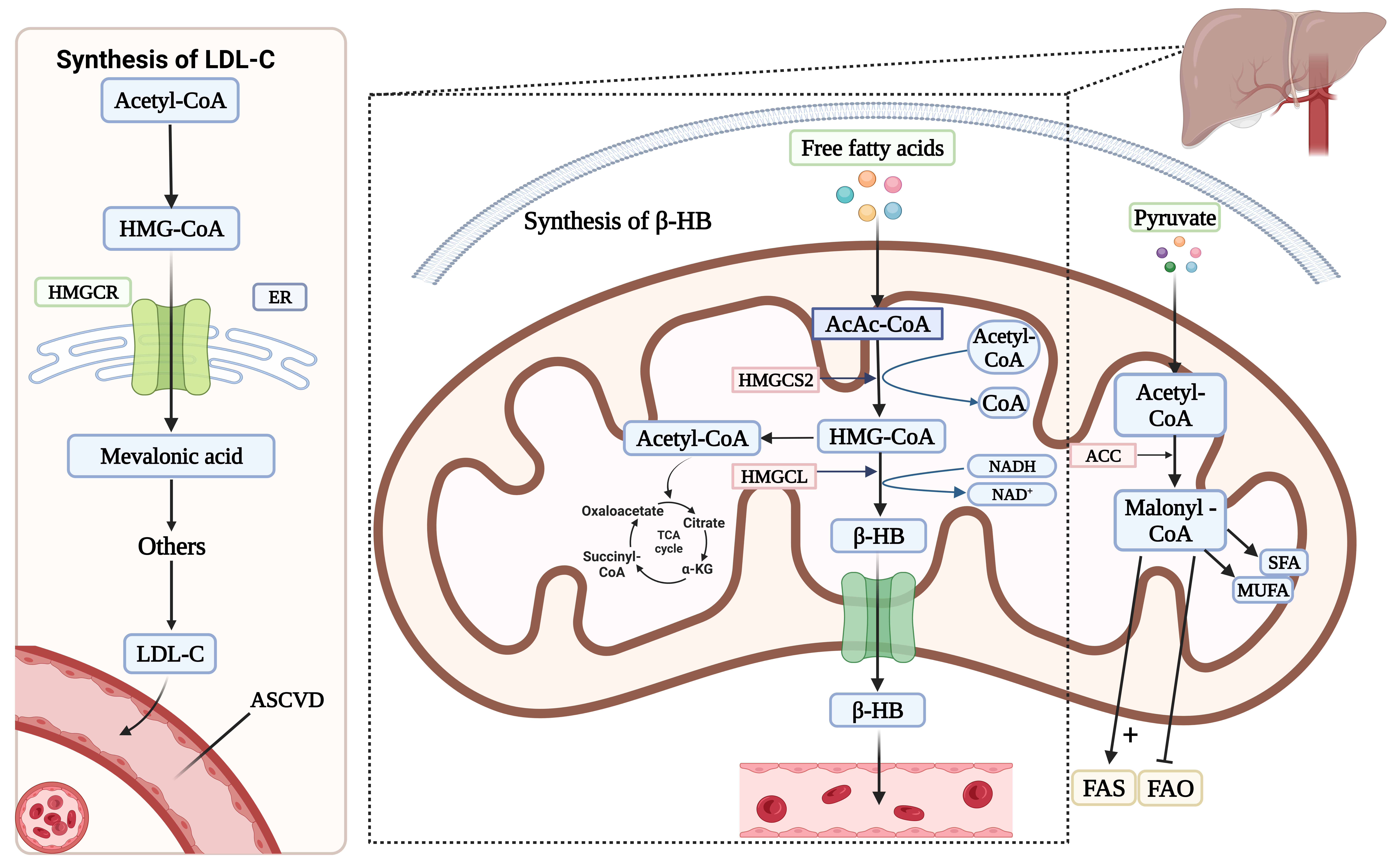 The key enzyme, HMG-CoA holds paramount significance in the regulation of CVDs. HMGCS2 and HMGCR, in conjunction with acetyl-CoA, stearoyl-CoA desaturase (SCD1), and fatty acyl-CoA synthetase, establish critical connections to CVDs across various dimensions. The expression levels of these enzymes can differ across different tissues of the human body [119]. The relationship between CVD and CoA metabolism can be delineated across three principal aspects: the liver, kidney, and the heart and cardiovascular system.