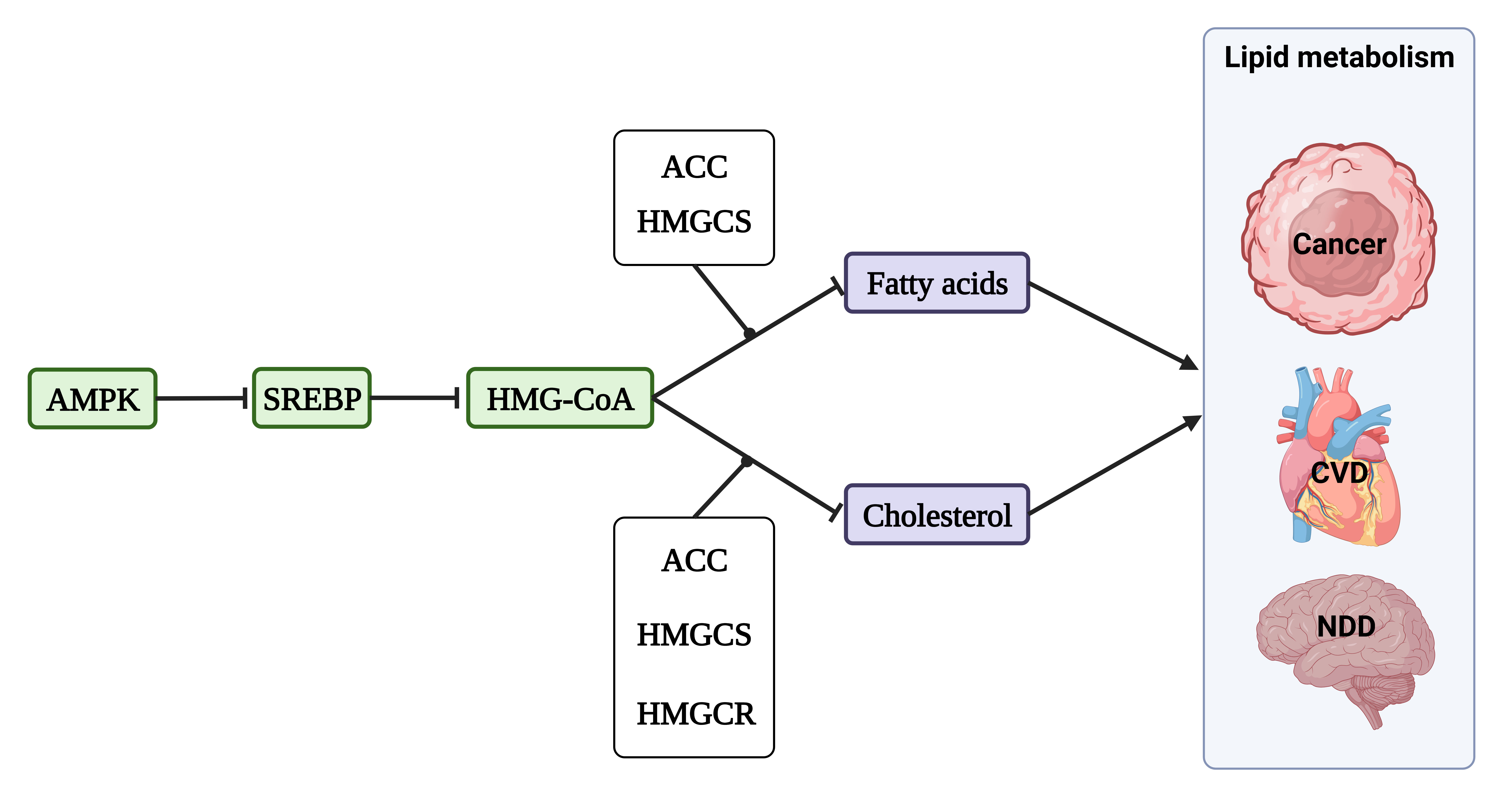 Fig. 4.Lipid metabolism in cancer, CVDs, and neurodegenerative diseases (NDD). The activation of AMP-activated protein kinase (AMPK) inhibits the activity of sterol regulatory element-binding protein (SREBP), resulting in a subsequent decrease in the expression of two key enzymes involved in HMG-CoA biosynthesis, namely HMG-CoA reductase (HMGCR) and HMG-CoA synthase (HMGCS). This negative regulation of FA and cholesterol synthesis ultimately impact the overall process of lipid metabolism in various diseases.