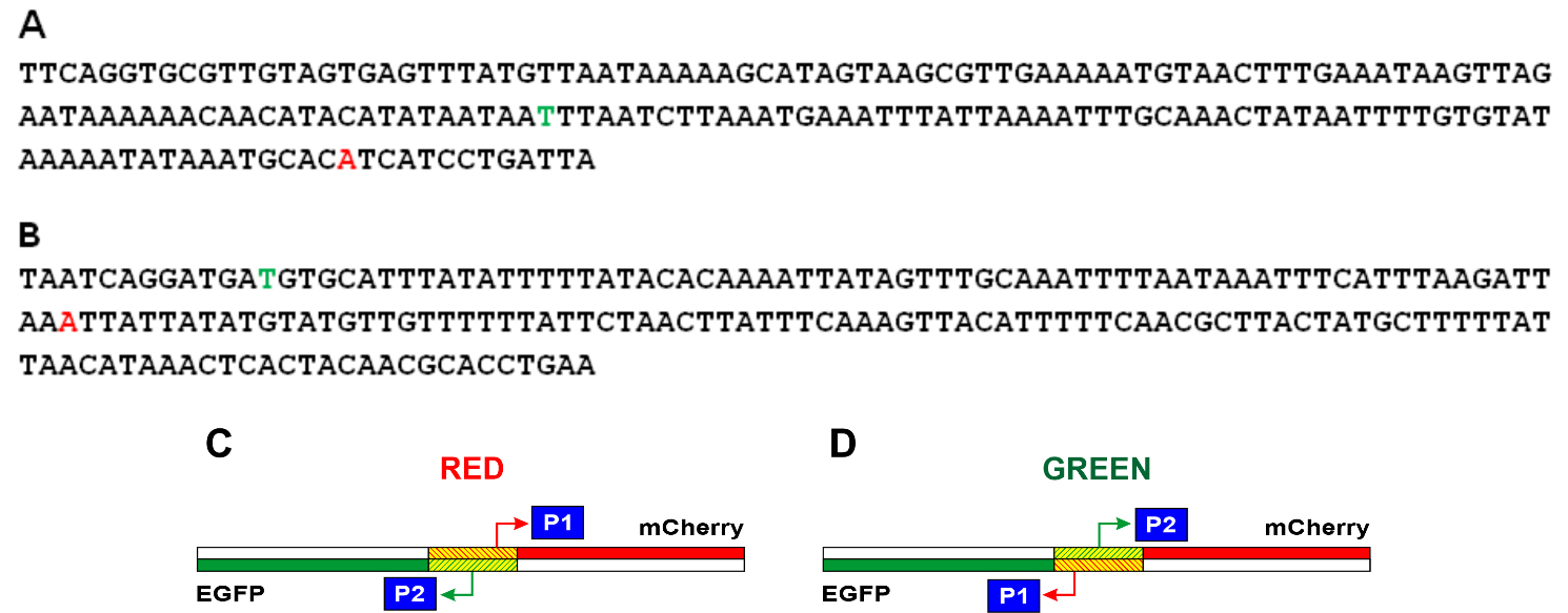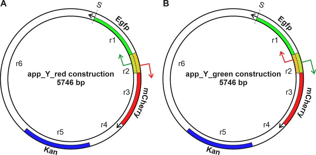 Fig. 1.Schematic representation of two genetic constructions. In the Red (A) and Green (B) constructions, the mCherry gene is shown in red, the Egfp gene in green, and the Kanamycin gene in blue. A fragment of Escherichia coli (E. coli) DNA located between the mCherry and the Egfp genes is shaded. Point S indicates the beginning of the numbering of the nucleotide sequence.
