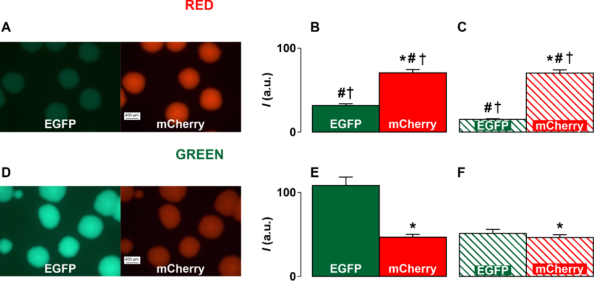 and green fluorescent proteins in the case of the Red (C) and Green (F)