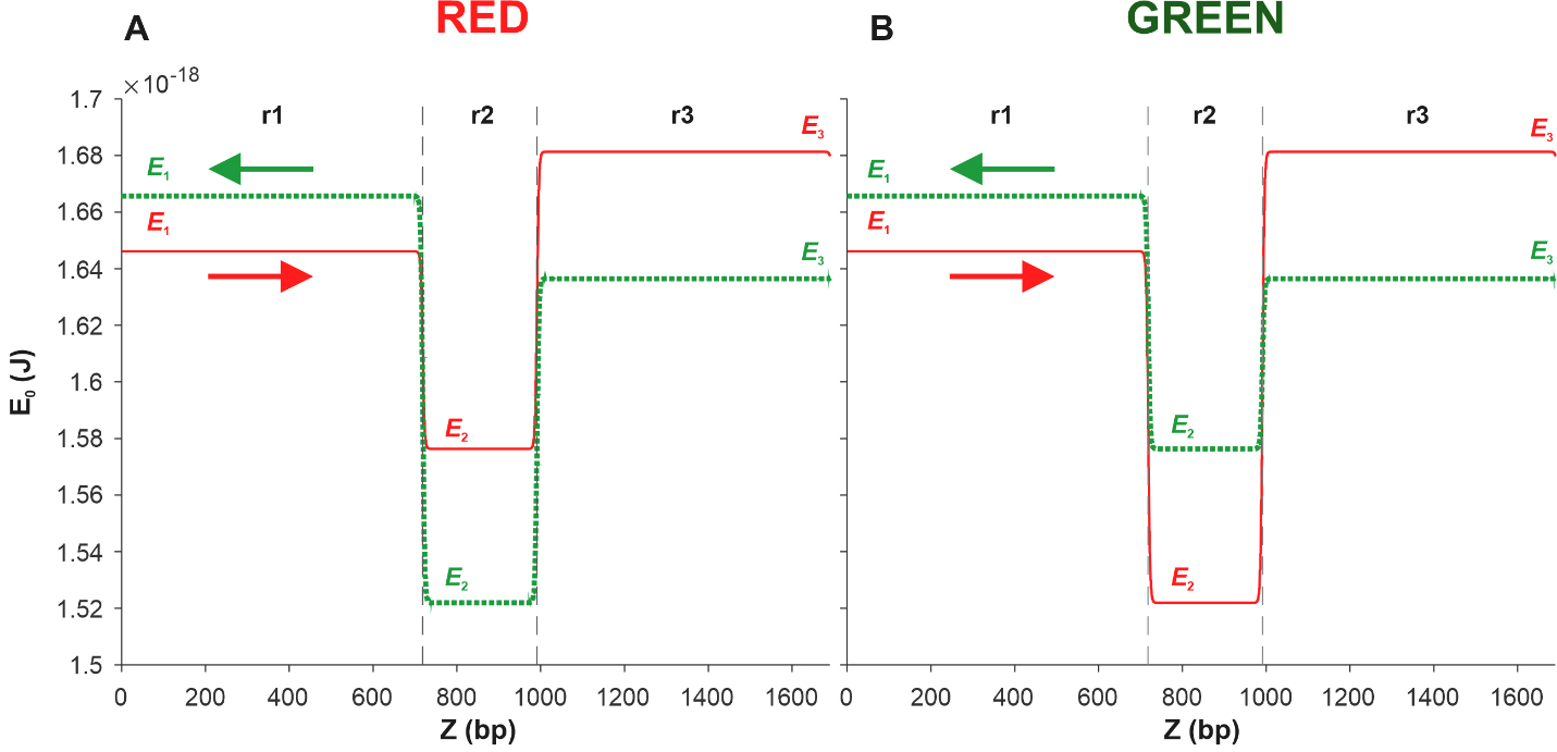 In [17], using Eqn. 15, the energy profiles of the coding and complementary sequences of the Red and Green constructions were calculated. It was shown that in both cases, the deepest well corresponds to the region located between the red and green protein genes. This result allowed us to suggest that kinks are most likely to be activated in this region, which, in turn, suggests that promoters and, accordingly, transcription starts are located in this region. Further, we use this result to model the movement of the kink, placing the reference point in the middle of the region located between the red and green protein genes. We also limit our consideration to a small DNA fragment that includes only three regions, namely, the region denoted as r2 and located between the Egfp and mCherry genes, the region located to the left and denoted as r1, and the region located to the right and denoted as r3. Fig. 5A shows the results of the energy profile calculations obtained for the coding (red solid line) and complementary (green dotted line) sequences of the Red construction. Fig. 5B shows the energy profiles calculated for the Green construction.