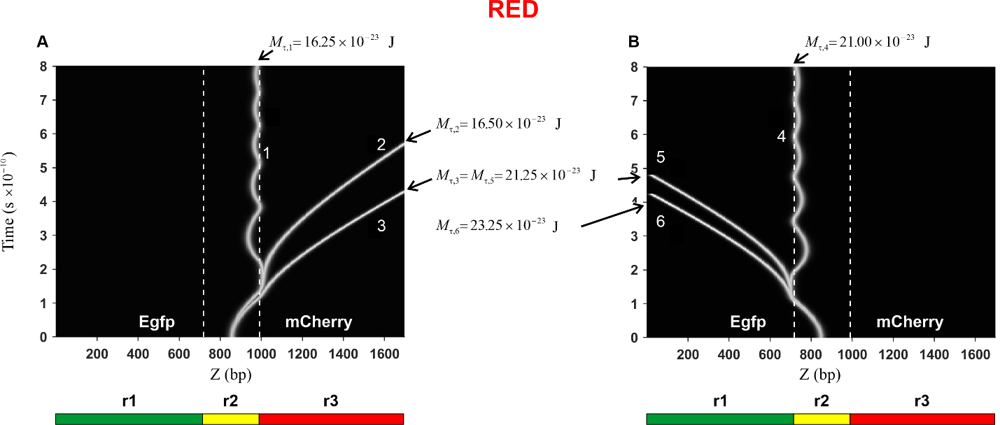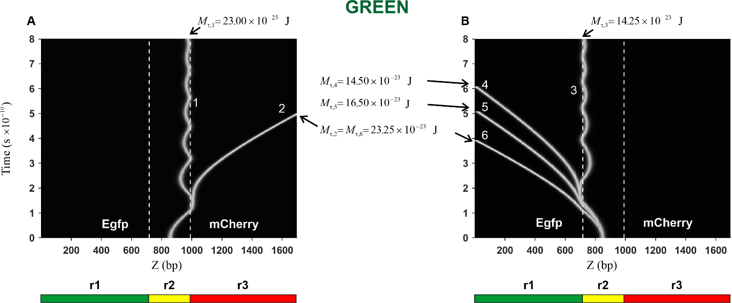 (1) When the kink movement starts from the middle of the region r2 towards the red protein gene, the threshold value of the torsion moment is less than the threshold value when the kink moves from the same start point towards the green protein gene. It follows that it is the movement of the kink towards the red protein gene that will be preferable, which means that in the case of the Red construction, more red proteins will be produced. This conclusion agrees with the obtained experimental data, as well as with the predictions made in [17].