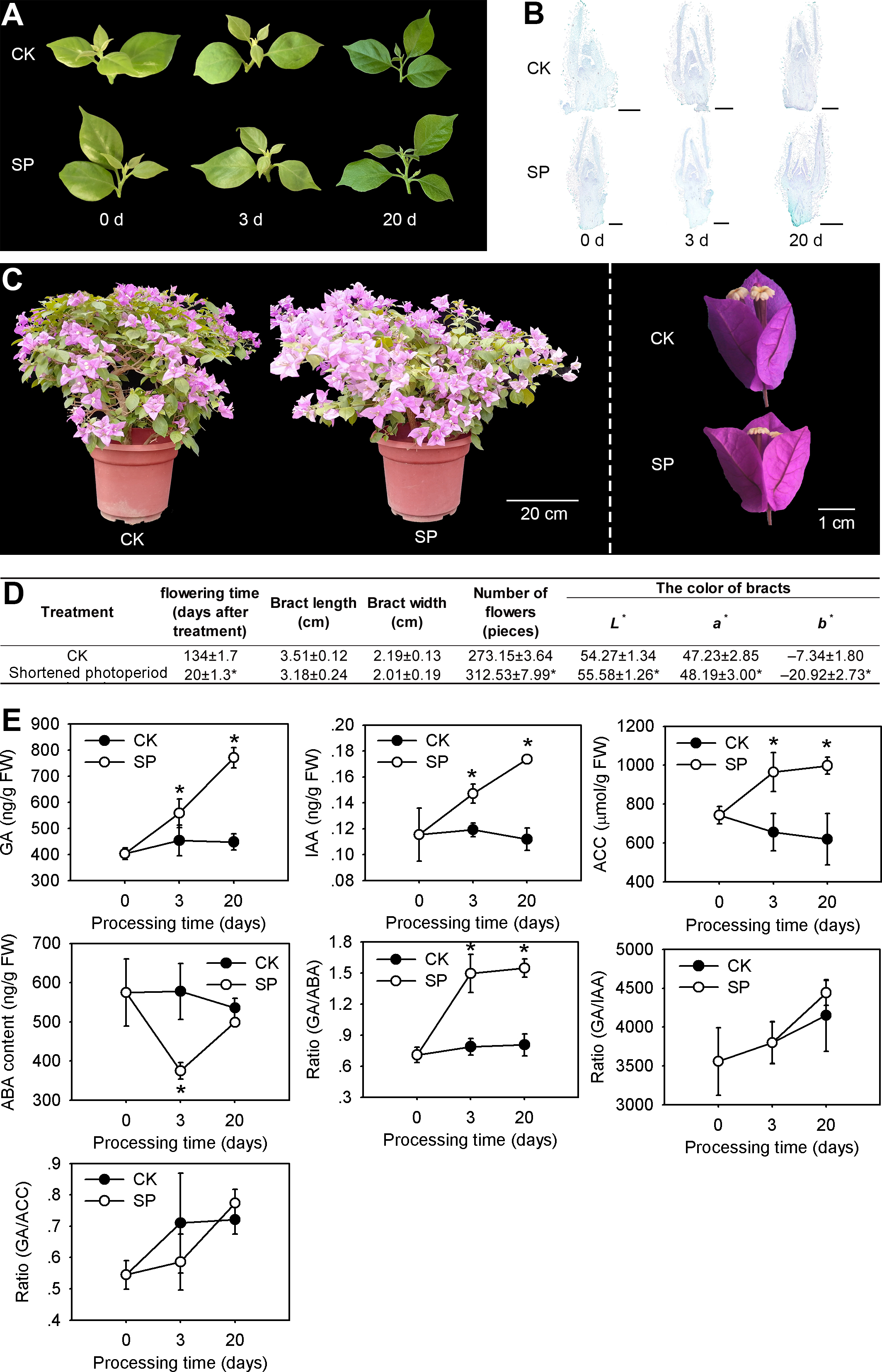 In B. glabra ‘Sao Paulo’, no flower buds were found on days 0 and 3 under shortened photoperiod; flower buds appeared on day 20. No flower buds were found in any of the CK plants (Fig. 1A).