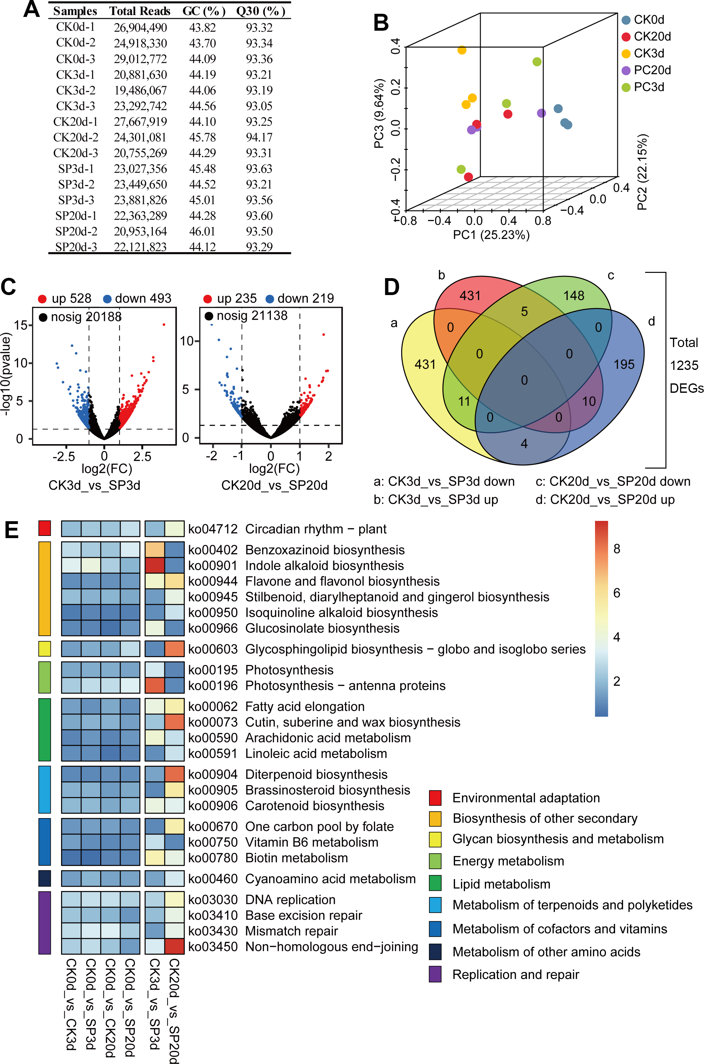 Fig. 2.Overview of transcriptomic data of apical buds in the shortened photoperiod (SP) treatment and control (CK) groups. (A) Data quantity statistics after quality control. (B) Principal component analysis (PCA) based on all unigenes identified using RNA-sequencing (RNA-Seq). (C–E) Volcano graph (C), Venn diagram (D), and Kyoto Encyclopedia of Genes and Genomes (KEGG) enrichment pathway analysis (E) of DEGs among the CK3d vs. SP3d and CK20d vs. SP20d comparison pairs. The top 25 variational KEGG enrichment pathways of DEGs from days 3 to 20 were selected for display, and the respective enrichment factors were used to generate the heat map.