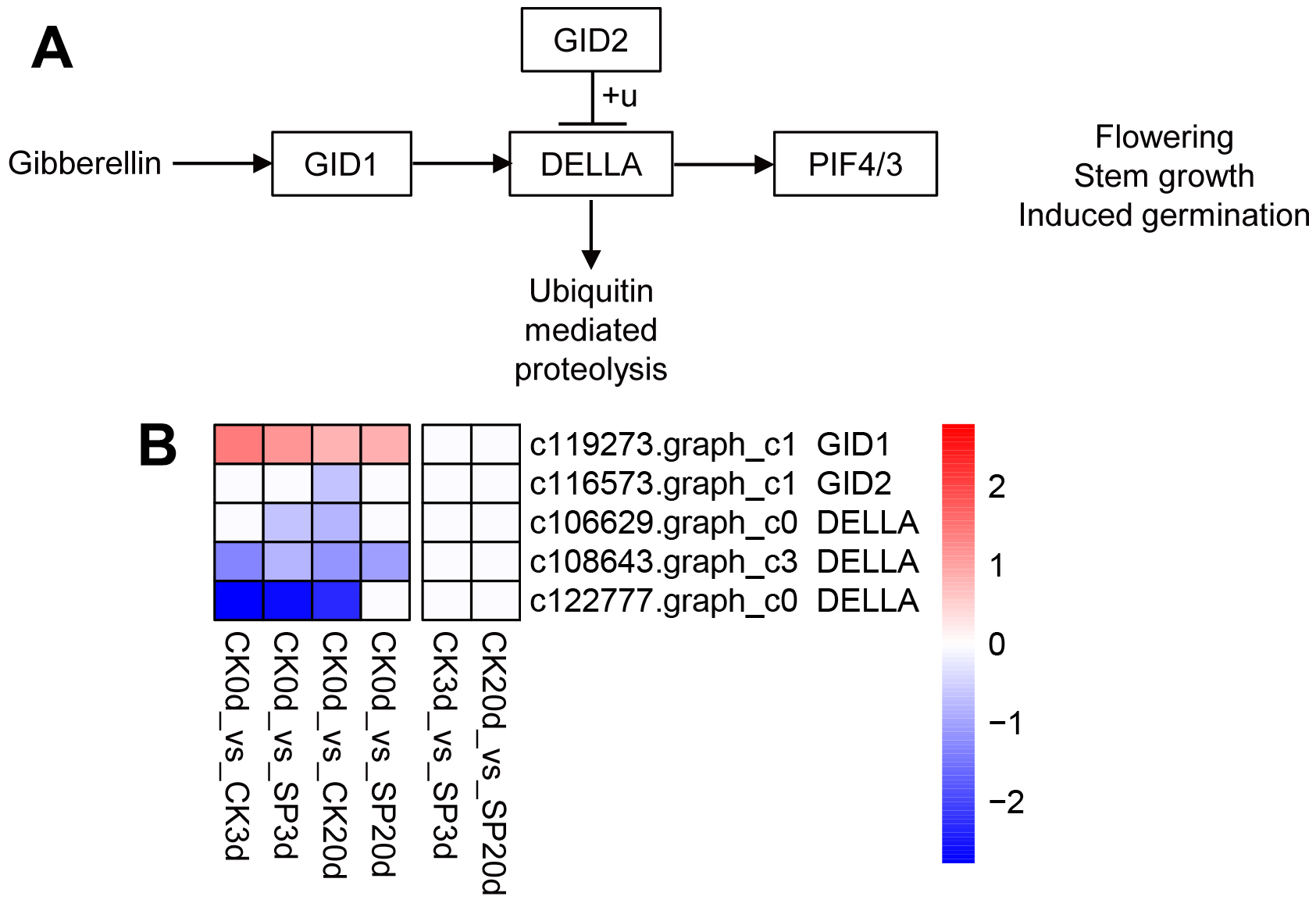 Fig. 3.Comparison of the differential metabolites and genes associated with the gibberellin metabolism pathways. The different colors indicate the expression level changes compared with the corresponding control group. CK represents the control group, and SP represents the shortened photoperiod treatment group. (A) Possible paths of GA signaling: the transmission of GA signals triggers the induction of flowering and growth, thereby promoting flowering. (B) Heatmap of the DEGs associated with gibberellin metabolism. In the corresponding comparison pairs, red indicates upregulation of expression, blue indicates downregulation of expression, and white indicates no difference in expression.