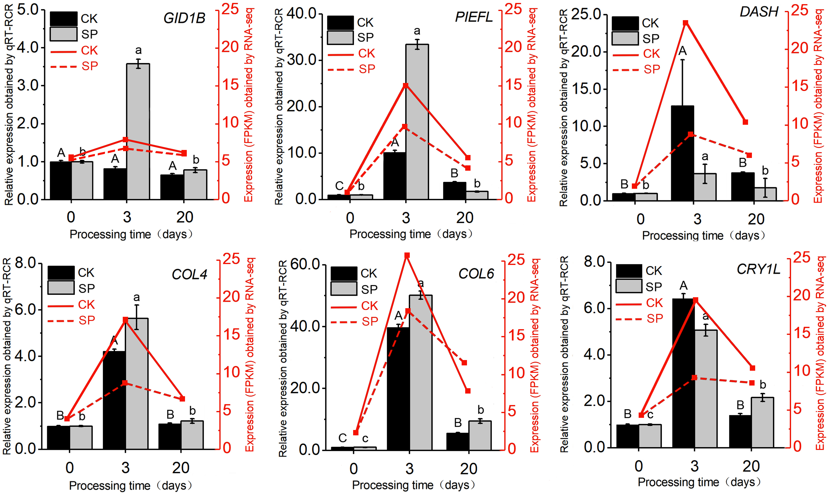 levels detected using qRT-PCR (red line). The x-axis represents the processing