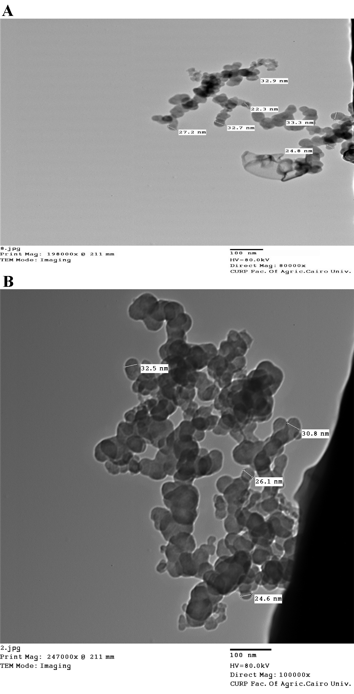 The size and shape of iron oxide and iron folate core–shell nanoparticles were determined using the transmission electronic microscope (TEM). The microscope (JEOL -Tokyo -Japan- JEM.1400 electron microscope) was used for the TEM characterization of nanoparticles. A drop of the nanoparticle solution was placed on a carbon grid and let dry in a descriptor before being spotted with TEM.