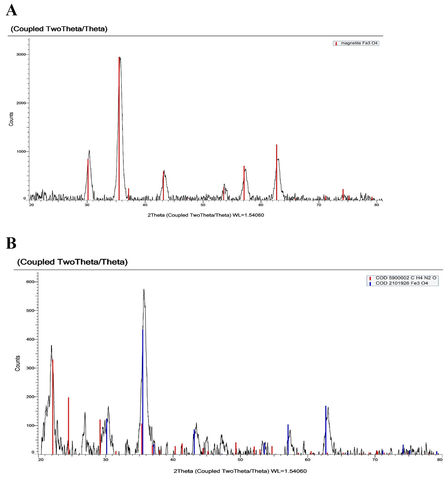 A total of 0.1 g folic acid was added to 100 mL of deionized water, agitated for 30 minutes at 60 °C, and then exposed to ultra-sonication for two hours at 0.9 cycles and 90% amplitude. After adding 50 mL of previously prepared folic acid, 0.1 g of magnetite nanoparticles were added to 50 mL of doubled deionized water and stirred for 0.5 hours with a mechanical stirrer. The mixture was then sonicated for 6 hours (0.6 cycles and 50% amplitude).