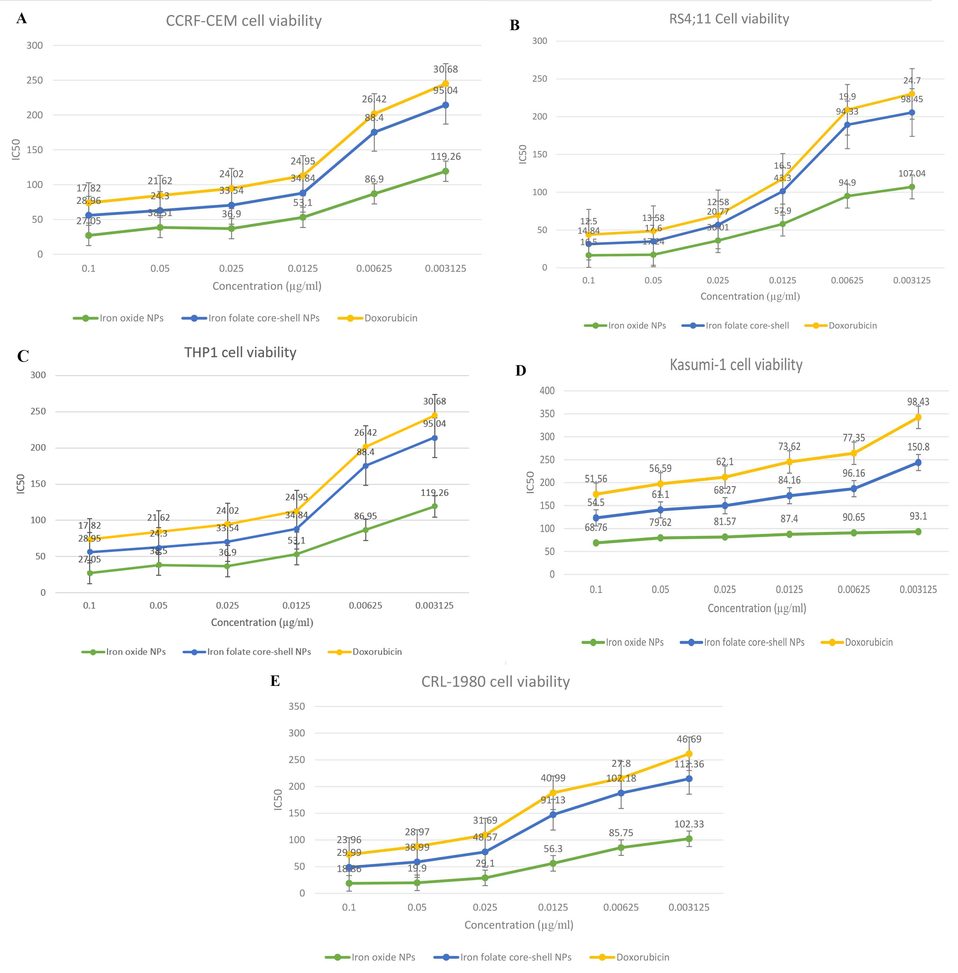 The cytotoxic effect of IONPs, iron folate core–shell NPs, and Doxorubicin
