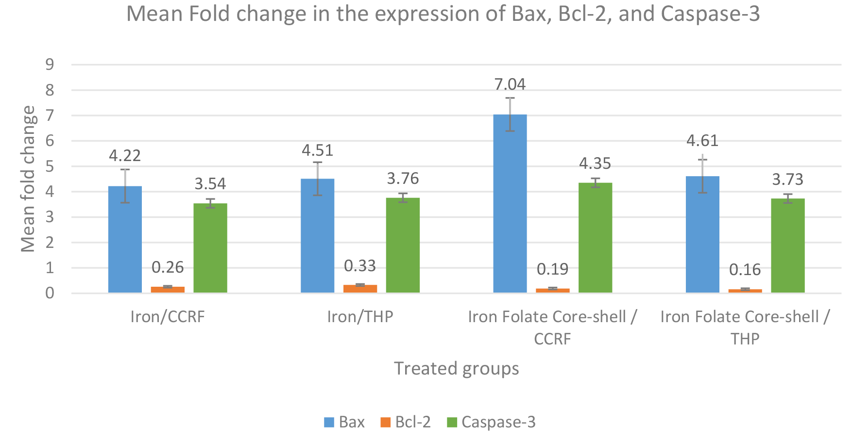 Our data demonstrate a high Bax and Casepase-3 expression level in the CCRF-CEM cell line treated with an iron folate core–shell compared with the THP cell line, while Bax and Caspase-3 expression in the CCRF-CEM and THP cell line treated with iron were slightly similar. On the other hand, Bcl-2 showed high expression in the THP cell line treated with iron compared with the CCRF-CEM cell line, while Bcl-2 expression in the CCRF-CEM and THP cell line treated with iron folate core-shell were slightly similar (Table 4, Fig. 8).
