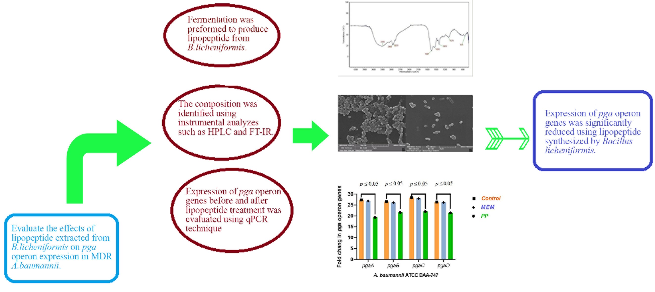 Building on these results, probiotic products produced by B. licheniformis have the potential to affect the pga operon, leading to defects in bacterial biofilms and reduced resistance. Therefore, these materials can be used to combat resistant strains of A. baumannii, providing a potential treatment option for patients with antibiotic-resistant bacterial infections. Additionally, the lipopeptide’s mechanism of action also reduces the expression of biofilm formation genes in MDR bacterial strains.