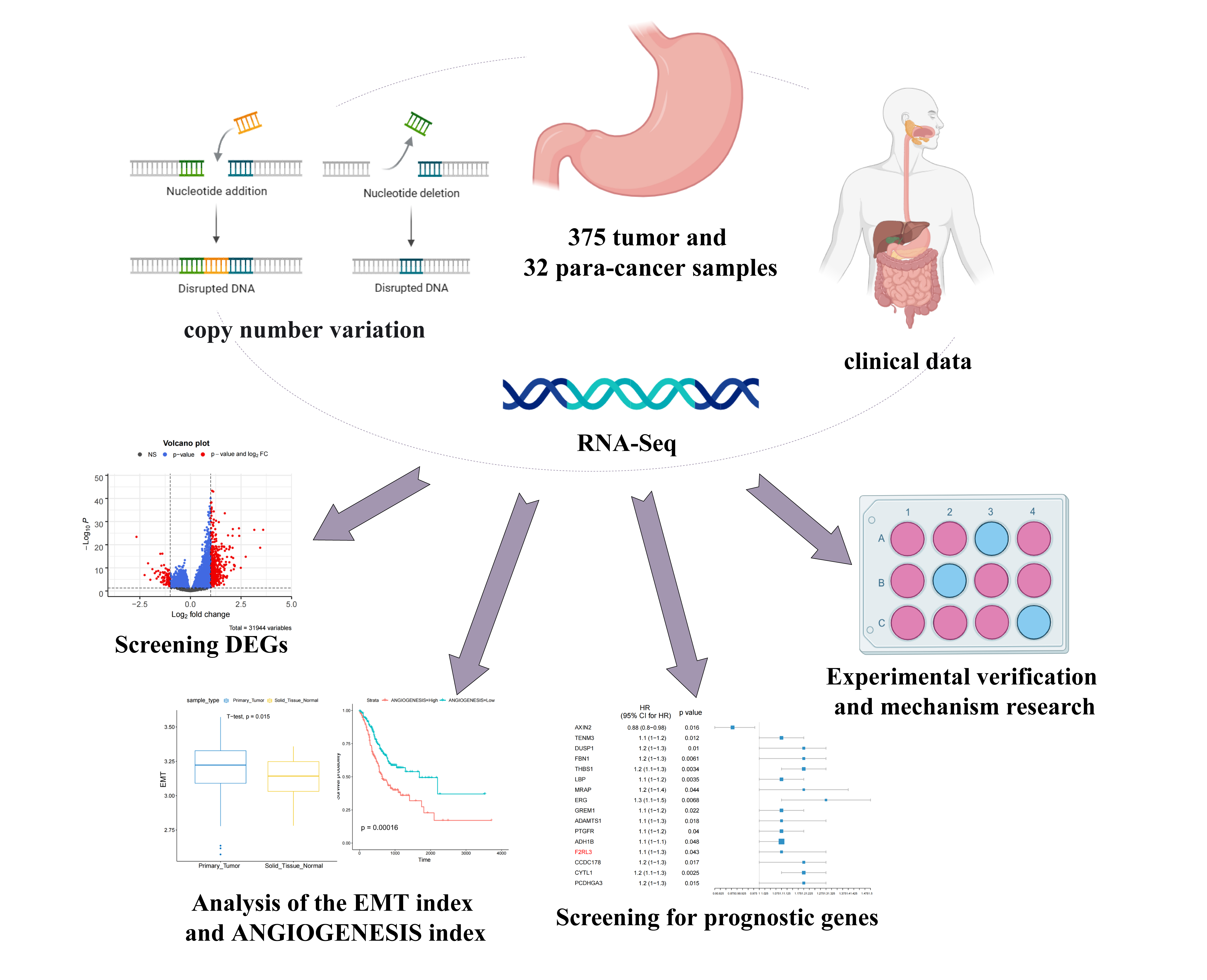 In this study, we downloaded RNA sequencing (RNA-Seq) data, copy number variation (CNV) data, and clinical data related to GC from The Cancer Genome Atlas (TCGA). The RNA-Seq data underwent single-sample gene set enrichment analysis (ssGSEA), and the samples were re-grouped according to the EMT and angiogenesis indexes, followed by correlation and survival analyses. Based on the CNV data, we performed screening to identify CNV-driven differentially expressed genes (DEGs). Finally, combined with the clinical data, prognostic genes were obtained by performing univariate Cox analysis of the CNV-driven DEGs. After conducting functional enrichment analysis, protein–protein interaction (PPI) analysis, and Kaplan-Meier (K-M) analysis of the obtained genes, F2R like thrombin or trypsin receptor 3 (F2RL3) was selected for further validation through cell experiments. In conclusion, by combining bioinformatics analysis and experimental investigations, this study lays the groundwork for a better understanding of the potential molecular mechanism of GC metastasis and offers a novel targeted therapy for GC.