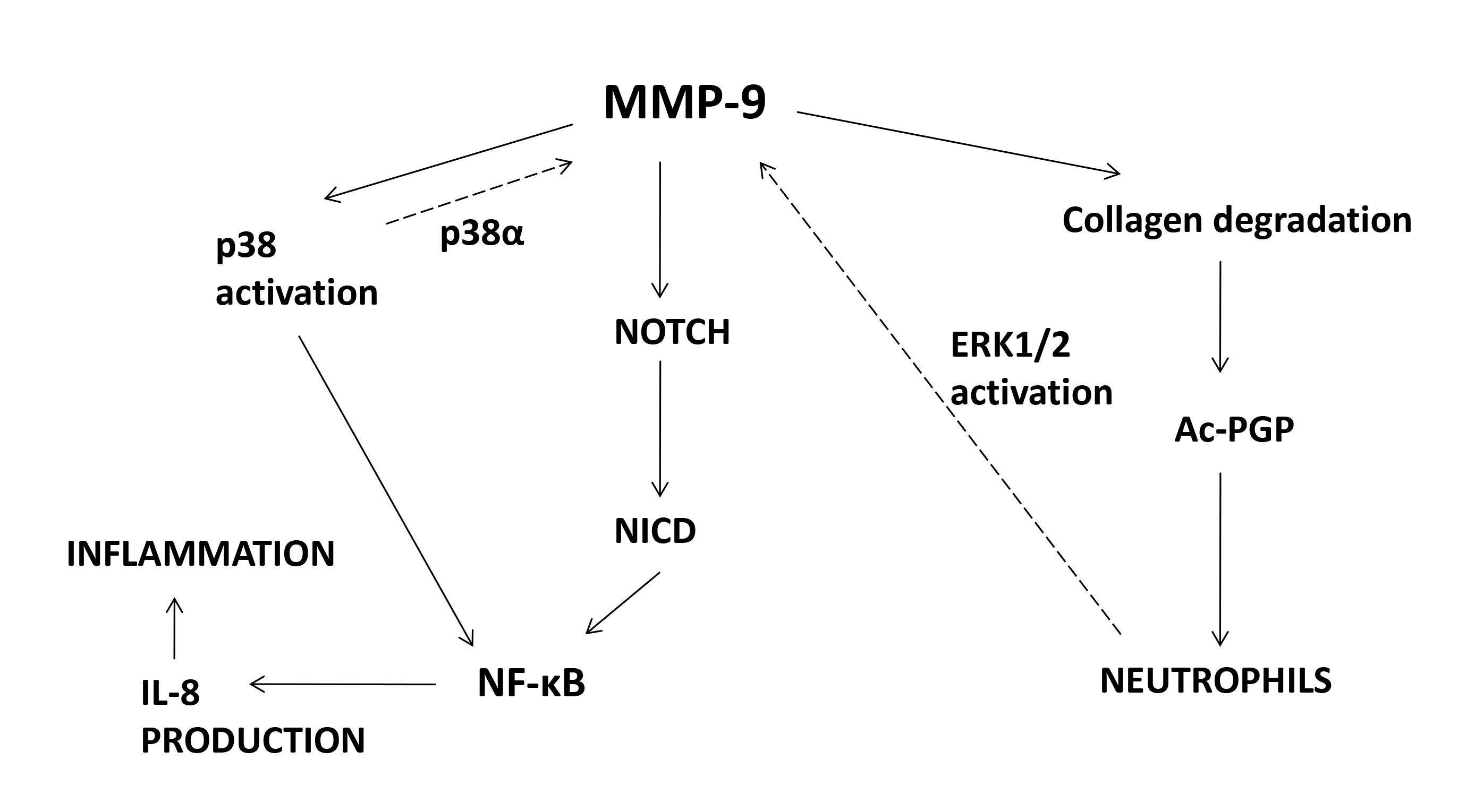 Signaling molecules affected by MMP-9. MMP-9, matrix metalloprotease-9; Ac-PGP, N-acetyl–proline–glycine–proline; NICD, Notch intracellular domain; IL-8, interleukin-8; NF-κB, nuclear factor-κB; ERK1/2, extracellular signal-regulated protein kinase 1/2; p38, p38 mitogen-activated protein kinase.