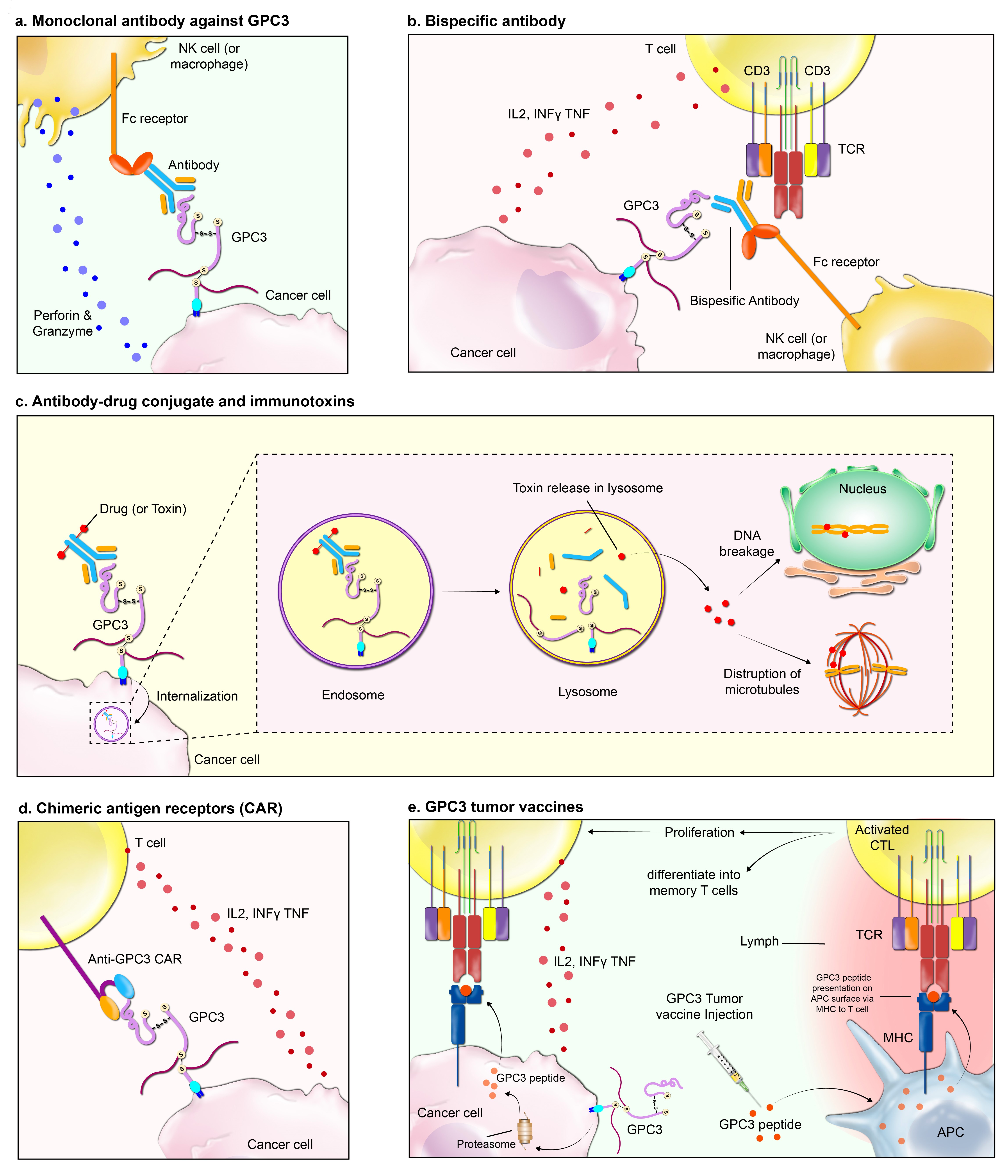 Fig. 1.The figure depicts a suite of immunotherapeutic interventions targeting glypican-3 (GPC3), a cell surface proteoglycan commonly upregulated in various malignancies. The methodologies are as follows: (a) Monoclonal Antibody Therapy: An antibody specific to GPC3 identifies and binds to the antigen on tumor cells, enabling immune effector cells, such as Natural Killer (NK) cells and macrophages, to recognize and eliminate the tagged cells via Fc receptor-mediated mechanisms. (b) Bispecific Antibody Approach: Utilizing a dual-affinity construct, this antibody simultaneously engages GPC3 on the tumor cells and CD3 on T cells. This dual binding facilitates the T cells’ cytotoxic attack on the tumor cells. (c) Antibody-Drug Conjugates and Immunotoxins: Antibodies conjugated to cytotoxic agents target GPC3, facilitating internalization into the tumor cell. Subsequent intracellular release of the toxin leads to cell death through mechanisms such as DNA damage or microtubule disruption. (d) Chimeric Antigen Receptor (CAR) T-Cell Therapy: T cells are genetically engineered to express CARs that specifically recognize GPC3, empowering them to directly target and lyse GPC3-positive tumor cells. (e) Tumor Vaccination Strategy: Vaccination with GPC3-derived peptides aims to prime the immune system, sparking a cascade that culminates in the activation and proliferation of cytotoxic T lymphocytes that can seek out and destroy GPC3-presenting tumor cells. Abbreviations: TCR, T cell receptor; MHC, major histocompatibility complex; CTL, cytotoxic T cell; APC, antigen-presenting cell; IL2, interleukin 2; INF, interferon; TNF, tumor necrosis factor.