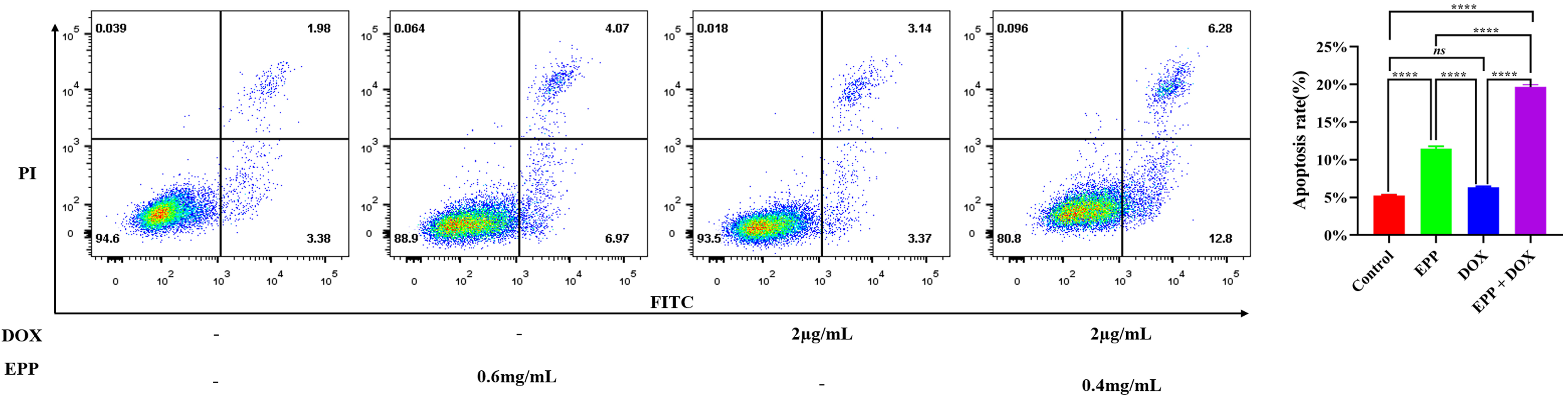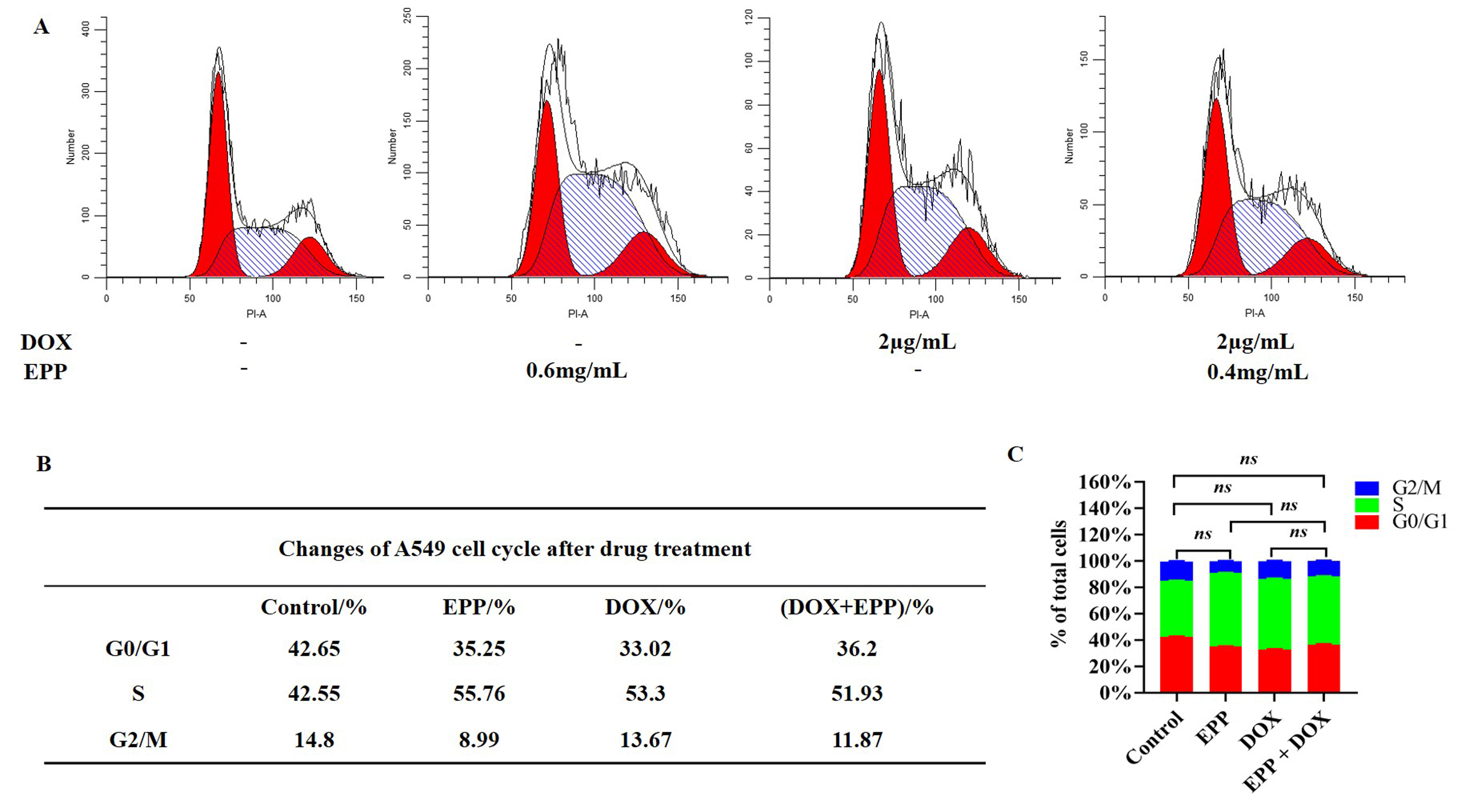 From the flow cytometry analysis of cell apoptosis and cell cycle distribution after 24 hours of drug treatment, it was revealed that the mixture of EPP and DOX led to a significant increase in apoptosis compared with the control group and treatment groups with a single drug. The cell cycle was blocked at the G1-S phase, which enhancing the inhibitory effect of the drug mixture on A549 cell proliferation.