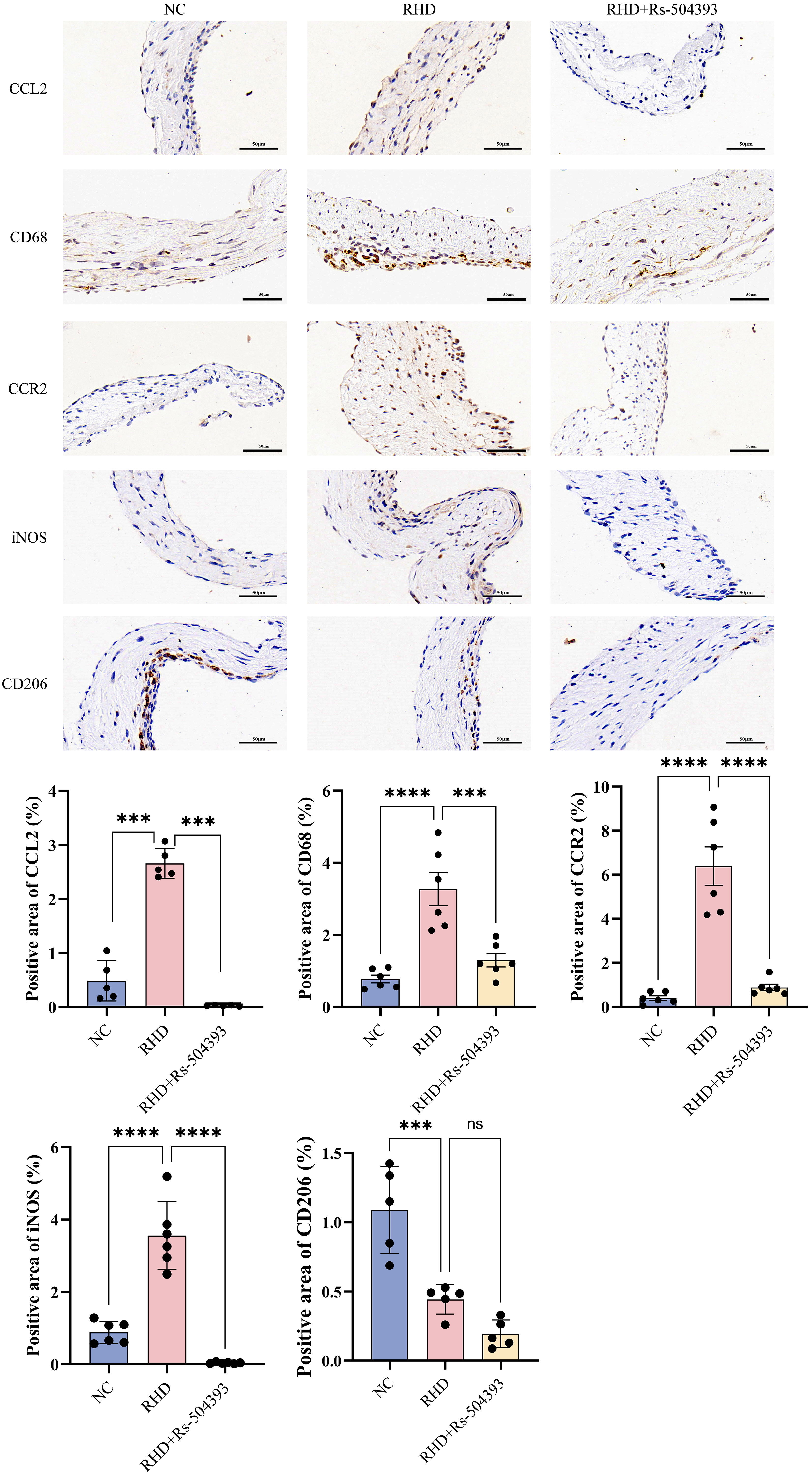 of CCL2, CD68, CCR2, iNOS, and CD206 in the NC group, RHD group, and