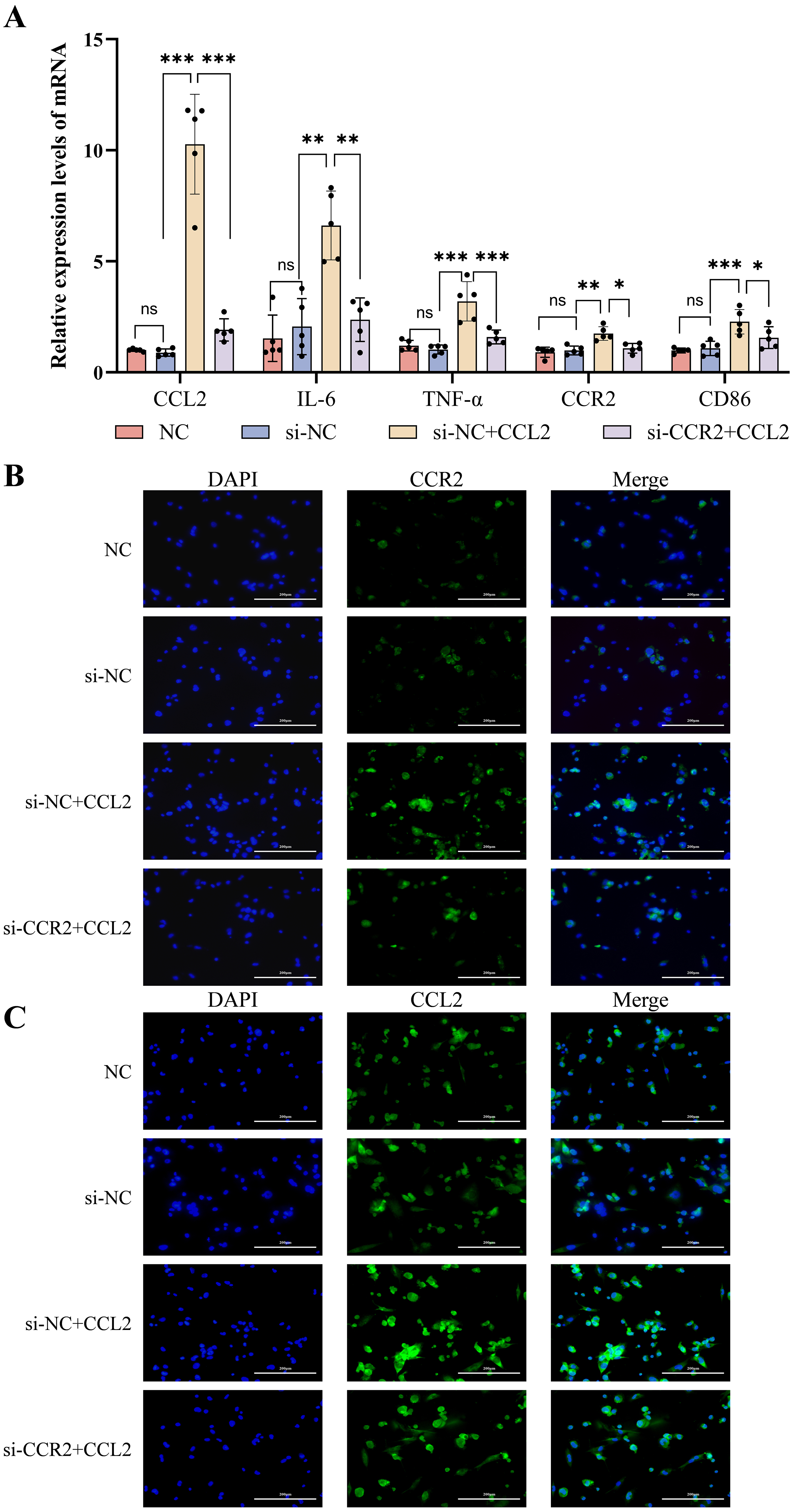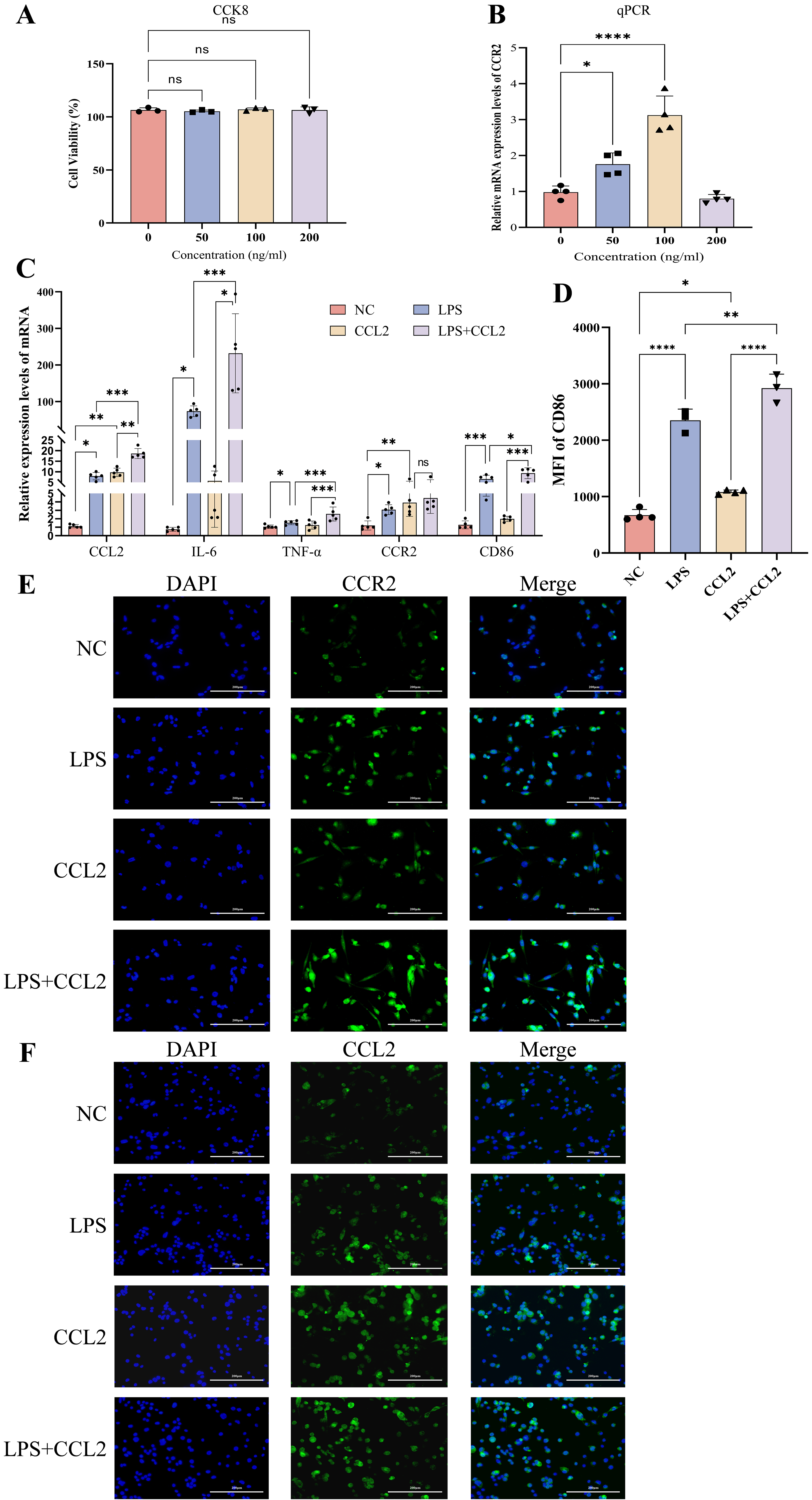 Human monocytic leukemia cells were sourced from Wuhan Punosai Life Science and Technology Co., Ltd. All cell lines underwent validation by STR profiling and tested negative for mycoplasma contamination. Cells were cultured in a humidified incubator at 37 °C with 5% CO2. Initially, THP-1 cells were induced into M0 adherent morphology by treating them with 100 ng/mL phorbol 12-myristate 13-acetate (PMA, P8139, Sigma-Aldrich, Darmstadt, Germany) for 48 hours. The cells were then divided into four groups for different interventions: NC group, LPS group (100 ng/mL), CCL2 group (100 ng/mL), and LPS+CCL2 group, with LPS (100 ng/mL) serving as the positive control. Finally, cell lysates analyzed using RT-qPCR and Western blotting to assess the expression of CCR2 and CCL2, supplemented by immunofluorescence.