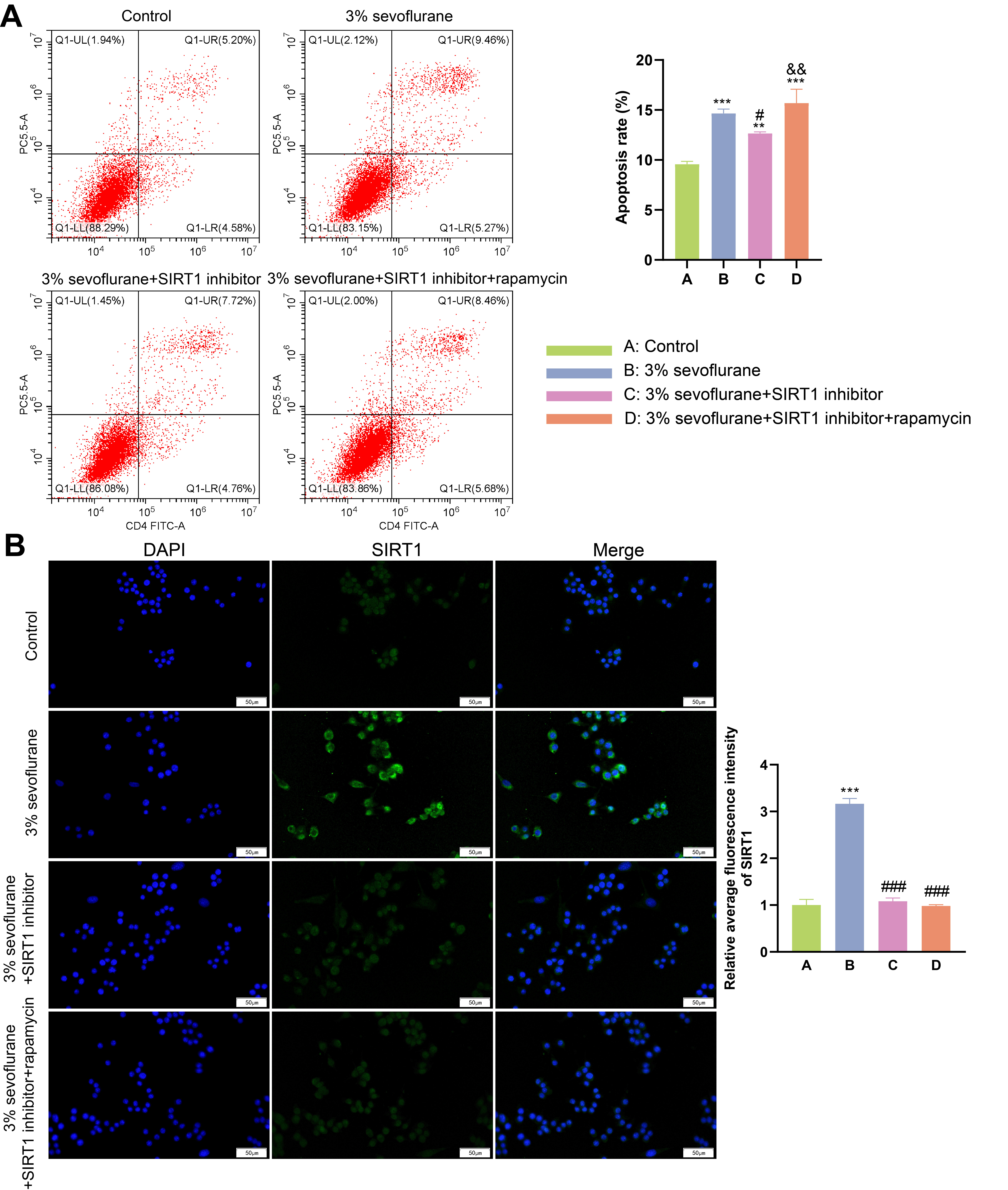Autophagy regulates apoptosis of hippocampal neurons in fetal rats induced by sevoflurane inhalation anesthesia. (A) Changes in apoptosis of fetal rat hippocampal neuron cells after different treatment. (B) The expression of SIRT1 was detected by immunofluorescence after different treatment. Scale bars, 50 µm. Statistical significance compared to the control group: **p < 0.01, ***p < 0.001; compared to 3% sevoflurane group: #p < 0.05, ###p < 0.001; compared to 3% sevoflurane + SIRT1 inhibitor group: &&p < 0.01. n = 3.