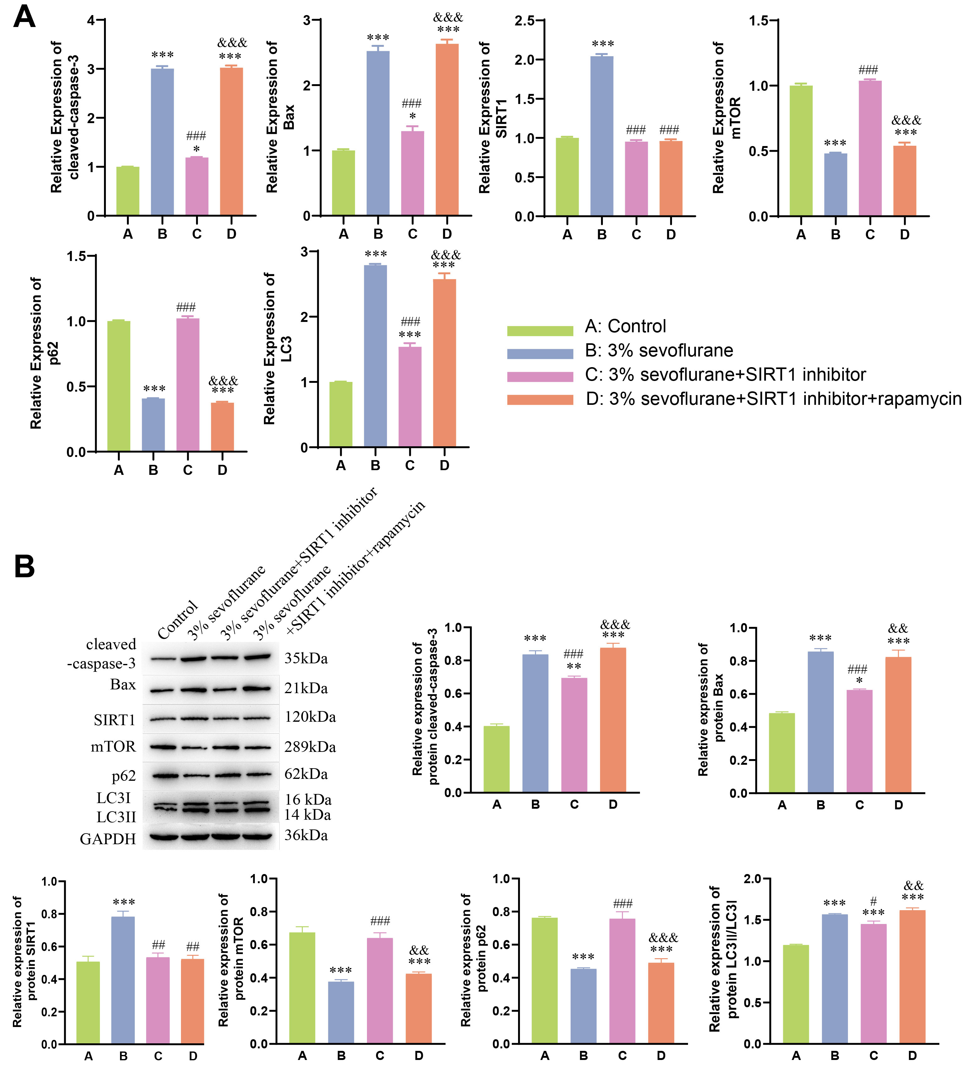 Neuroprotective effect of autophagy on fetal rat nerve cell apoptosis induced by sevoflurane inhalation anesthesia. (A) qPCR analysis of cleaved-caspase-3, Bax, SIRT1, mTOR, p62, and LC3II in fetal rat hippocampal neurons. (B) Western blot analysis of cleaved-caspase-3, Bax, SIRT1, mTOR, p62, and LC3II in fetal rat hippocampal neurons. Statistical significance compared to the control group: *p < 0.05, **p < 0.01, ***p < 0.001; compared to 3% sevoflurane group: #p < 0.05, ##p < 0.01, ###p < 0.001; compared to 3% sevoflurane + SIRT1 inhibitor group: &&p < 0.01, &&&p < 0.001. n = 3.