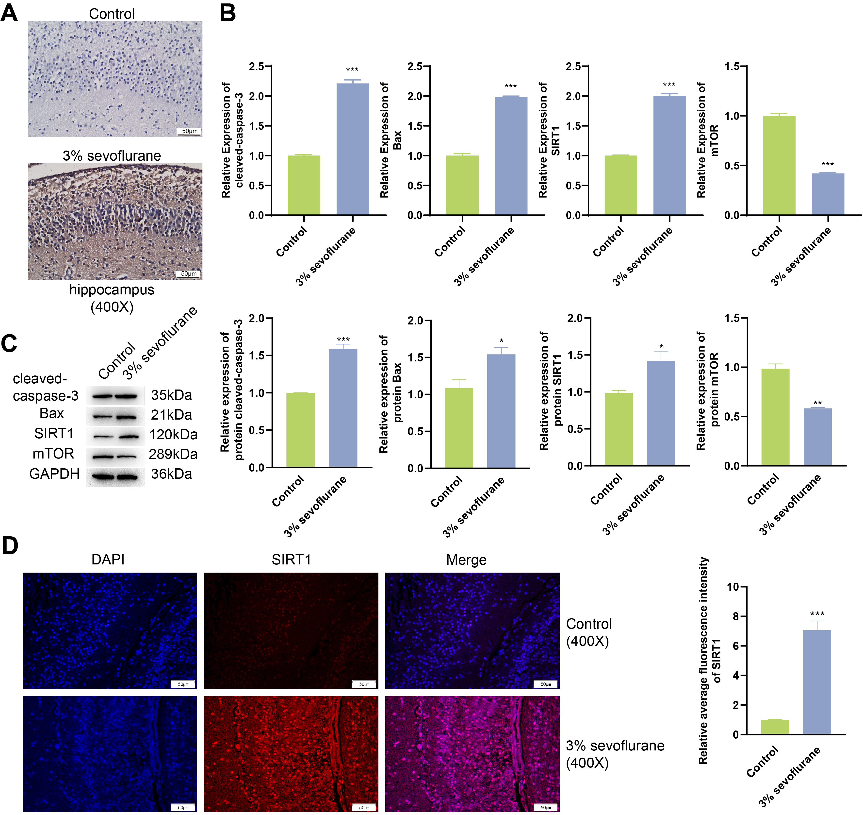Sevoflurane, a commonly used anesthetic in clinical settings, has detrimental effects on animal nervous system when inhaled at high concentrations for extended periods. Reports have suggested that prenatal exposure to sevoflurane inhibits the proliferation of fetal neural stem cells [18], neuronal migration, and axonal growth [19]. This inhibition leads to neuronal apoptosis [20] and a sustained imbalance between excitatory and inhibitory neurons in the medial prefrontal cortex [21], resulting in learning and memory deficits as well as anxiety-like behavior. Our study findings indicated an increase in apoptosis of fetal rat hippocampal neurons following sevoflurane treatment, potentially serving as a significant factor contributing to cognitive dysfunction. Apoptosis, a normal physiological process in the body, serves as a self-regulated programmed death mechanism, allowing to eliminate damaged or unnecessary cells to maintain normal structure and function of the tissues and organs. However, an abnormal activation of apoptosis leads to various diseases, including neurological disorders. In this study, we initially observed that inhalation of sevoflurane during fetal development resulted in increased apoptosis of hippocampal neurons in fetal rats. TUNEL experiment results showed a significantly higher apoptosis level in sevoflurane-treated group compared with the control group, supporting detrimental impact of sevoflurane on neural cells in fetal rats. Additionally, qPCR and western blot revealed a significant up-regulation in the expression of cleaved-caspase-3 and Bax in the 3% sevoflurane-treated group. Xu et al. [22] demonstrated increased levels of cleaved-Caspase-3 and Bax in HCN-2 cells after sevoflurane treatment. Similarly, Areias et al. [23] found a notable increase in cleaved-caspase-3 after sevoflurane treatment at 1.63 [1.56–1.77]% of brain volume. The results suggested that the developing brain is highly susceptible to anesthesia exposure, leading to an increase in cell apoptosis, as evidenced by a significant increase in SIRT1 expression and a marked decrease in mTOR expression.