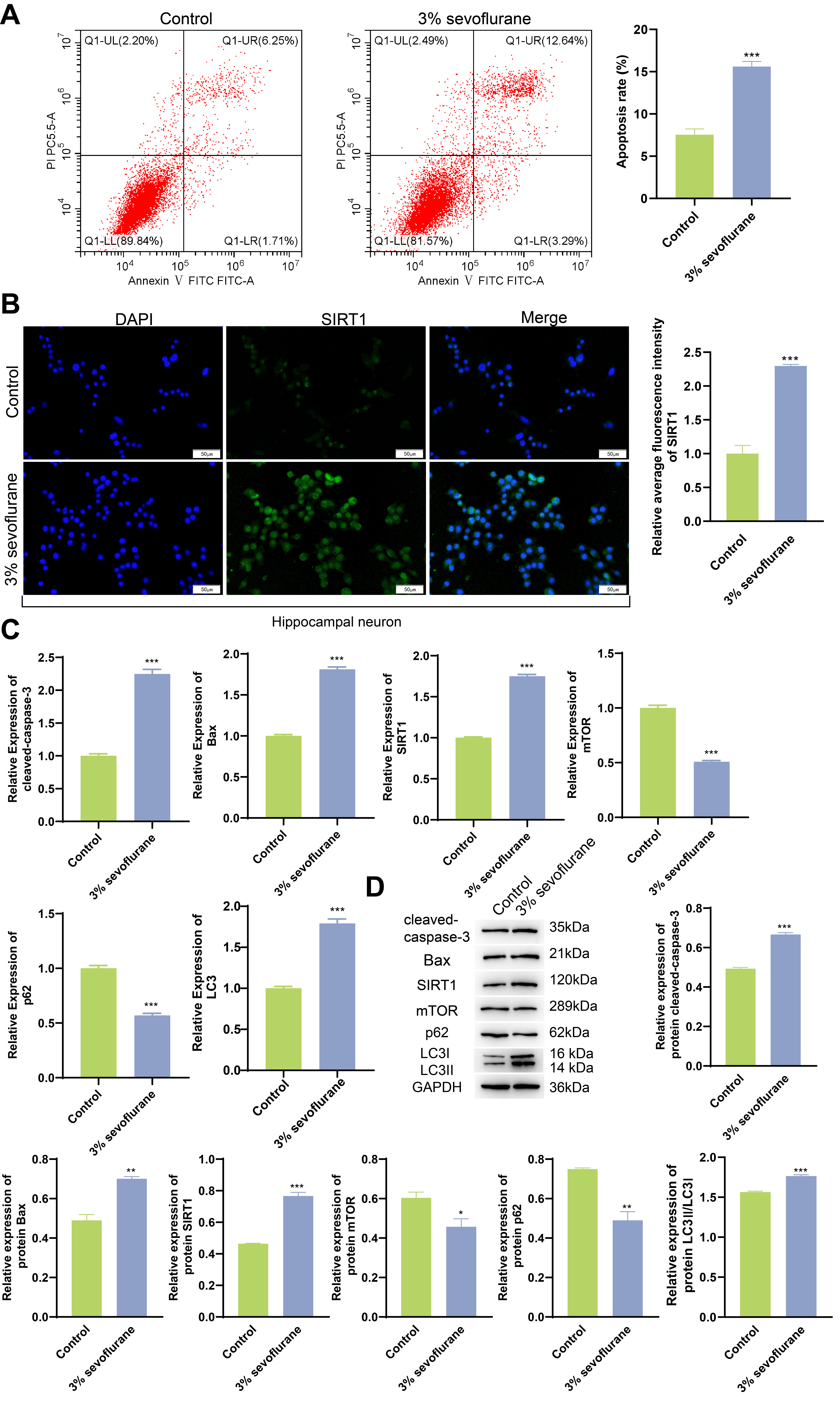 In conclusion, our research delineated that exposure to sevoflurane via inhalation in fetal rats precipitates an escalation in neuronal apoptosis, with the modulatory factors SIRT1 and mTOR assuming critical factors in this cascade. Over-expression of SIRT1 is implicated in the sevoflurane-induced augmentation of cellular autophagy, thereby conferring a protective mechanism against neuronal apoptosis. In contrast, mTOR imparts an antagonistic regulatory influence within this scenario. Our research elucidated the ramifications of anesthetic agents on neuronal cells, thereby providing a foundation for the formulation of future investigative endeavors focused on neuroprotective strategies. However, more investigations remain necessary to figure out detailed regulatory mechanisms of cellular autophagy in sevoflurane-induced neuronal apoptosis, and to validate the clinical significance and application potential of these findings. Firstly, further exploring the precise molecular interactions within the SIRT1-mTOR pathway and its role in neuronal apoptosis induced by sevoflurane exposure is essential. Subsequently, future research should focus on the role of key autophagy-related genes such as Beclin1 and LC3 to investigate the relationship between autophagy and sevoflurane-induced apotopsis in fetal rat hippocampal neurons. Additionally, large-scale clinical studies are required to assess the relevance of these findings in human patients undergoing sevoflurane anesthesia. These comprehensive investigations will not only expand our understanding of sevoflurane neurotoxicity but also pave the way for the development of novel therapeutic strategies for preventing or treating sevoflurane-induced apoptosis in neural cells.