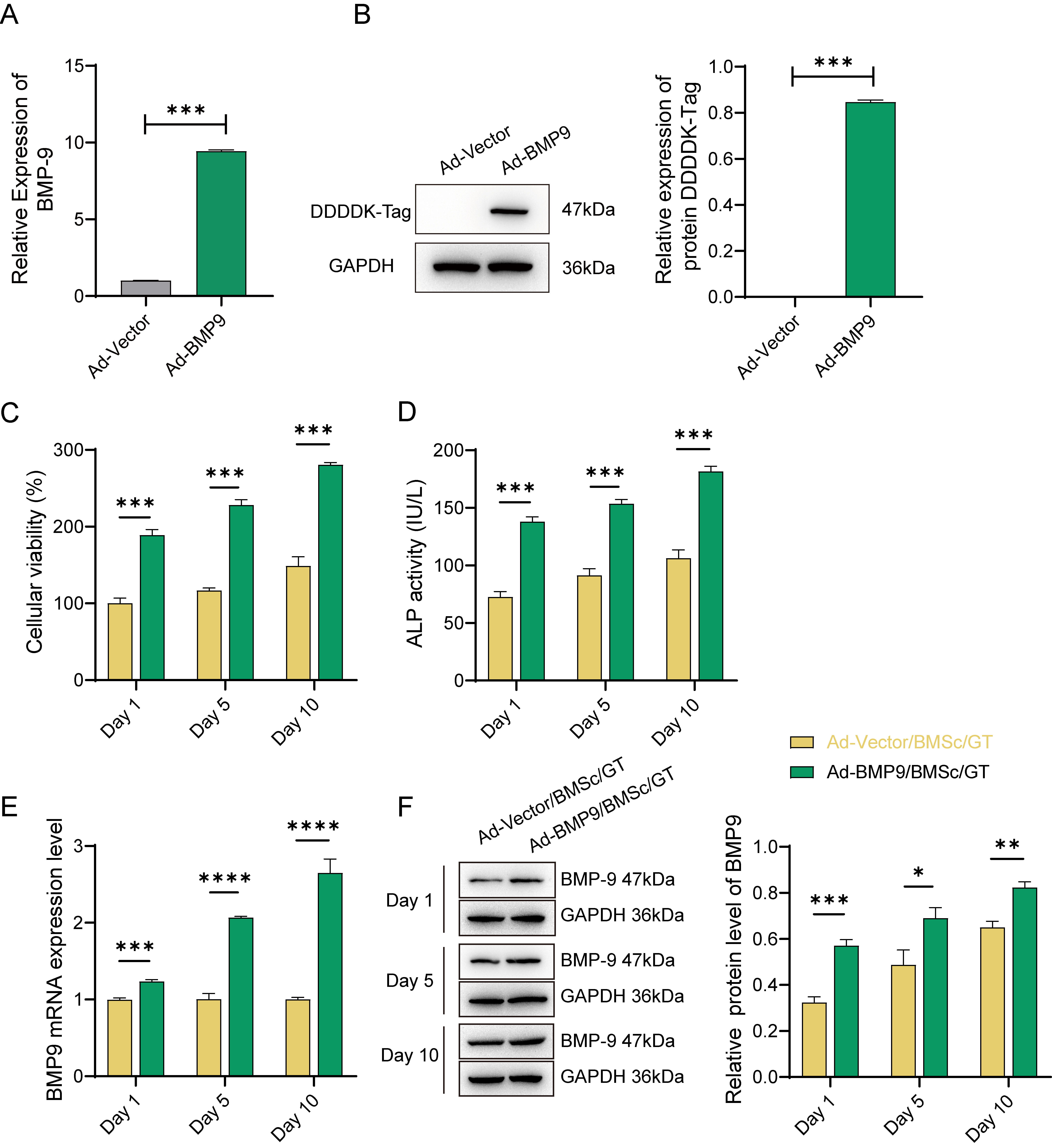 Ad-BMP-9/BMSc/GT with MG63 cells. (D) alkaline phosphatase (ALP) activity assay.