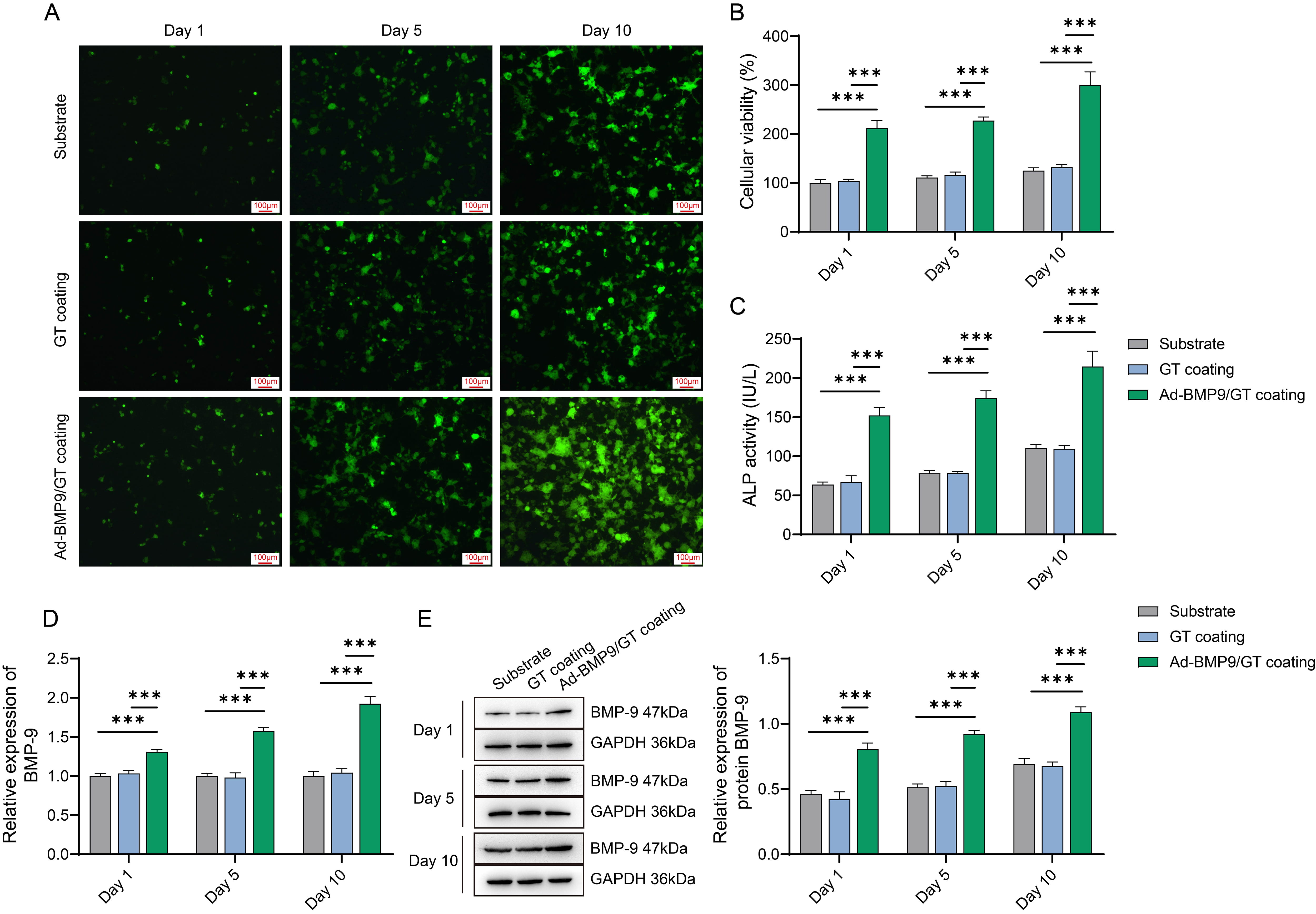 According to the experimental design the following three experimental subgroups were designed: (1) n-CDHA/PAA control group (without any coating treatment); (2) control group of composite biomaterials of n-CDHA/PAA with single-layer coated GT; and (3) experimental group of composite biomaterials of multilayered Ad-BMP-9/BMSc/GT coated n-CDHA/PAA. After co-culturing the materials of the experimental and control groups with well-grown MG63 cells for 10 days, the cell culture medium was aspirated at day 1, 5, and 10, respectively, followed by two washes with PBS. According to the protocols of the Cell Plasma Membrane Staining Kit with DiO (Green Fluorescence) (C1993S, Beyotime, Shanghai, China), an appropriate volume of green fluorescent cell membrane staining working solution was added and gently agitated to ensure uniform staining of all cells. The cells were incubated at 37 °C in the dark for 20 minutes. The cell membrane staining working solution was then aspirated, and the cells were washed three times with PBS. Finally, 37 °C pre-warmed cell culture medium was added, and the adhesion and growth of MG63 cells on the material surface were observed under an inverted biological microscope. The proliferation of MG63 cells and ALP activity were observed by CCK-8 and ALP activity analysis at three time points, respectively; and the proliferation of MG63 cells and the activity of ALP were detected by Quantitative Polymerase Chain Reaction (q-PCR) and Western Blot (WB), respectively, in the MG63 cells.