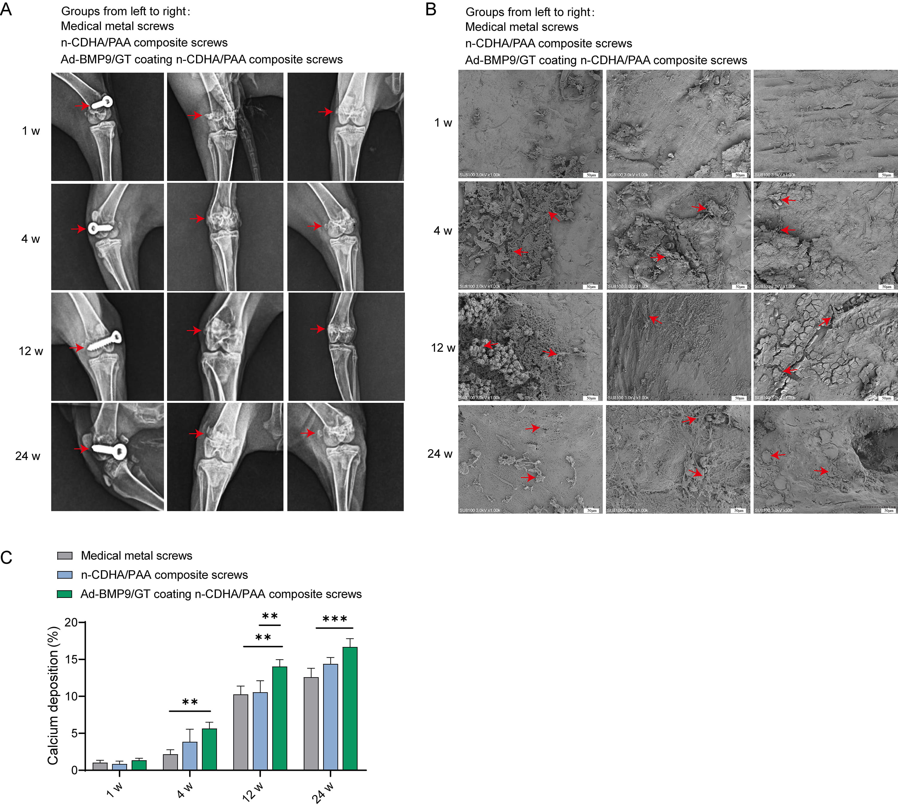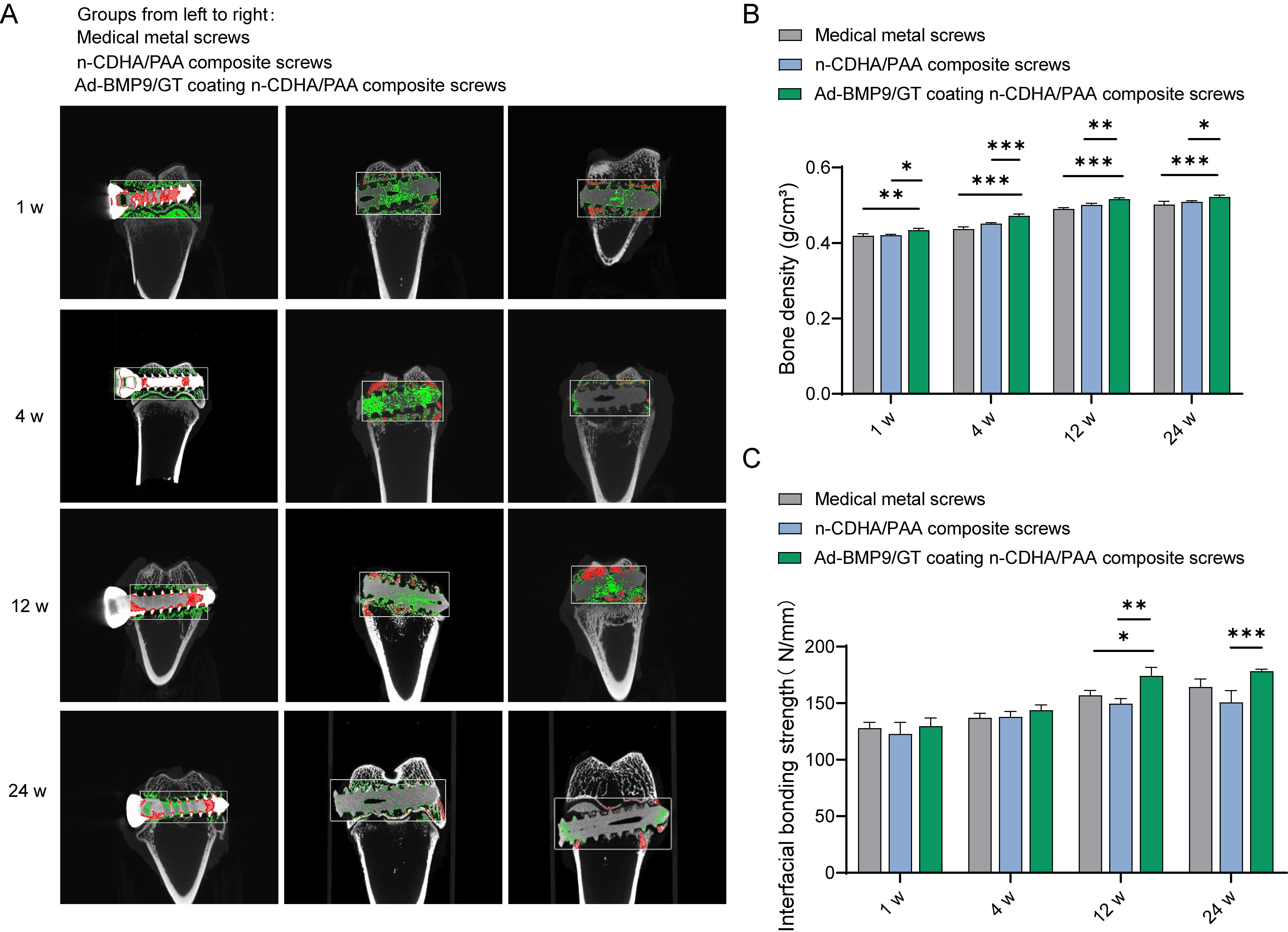 The Ad-BMP-9/GT coating significantly enhanced MG63 cell adhesion, proliferation, and differentiation, while increasing BMP-9 expression in vitro. In vivo studies using a rabbit femoral fracture model confirmed the biocompatibility and osteointegration potential of the multilayer Ad-BMP-9/BMSc/GT coated n-CDHA/PAA composite biomaterial screws. Compared to control groups (medical metal screws and n-CDHA/PAA composite biomaterial screws), this material demonstrated faster fracture healing, stronger osteointegration, and facilitated new bone tissue formation with increased calcium deposition at the material-bone interface.