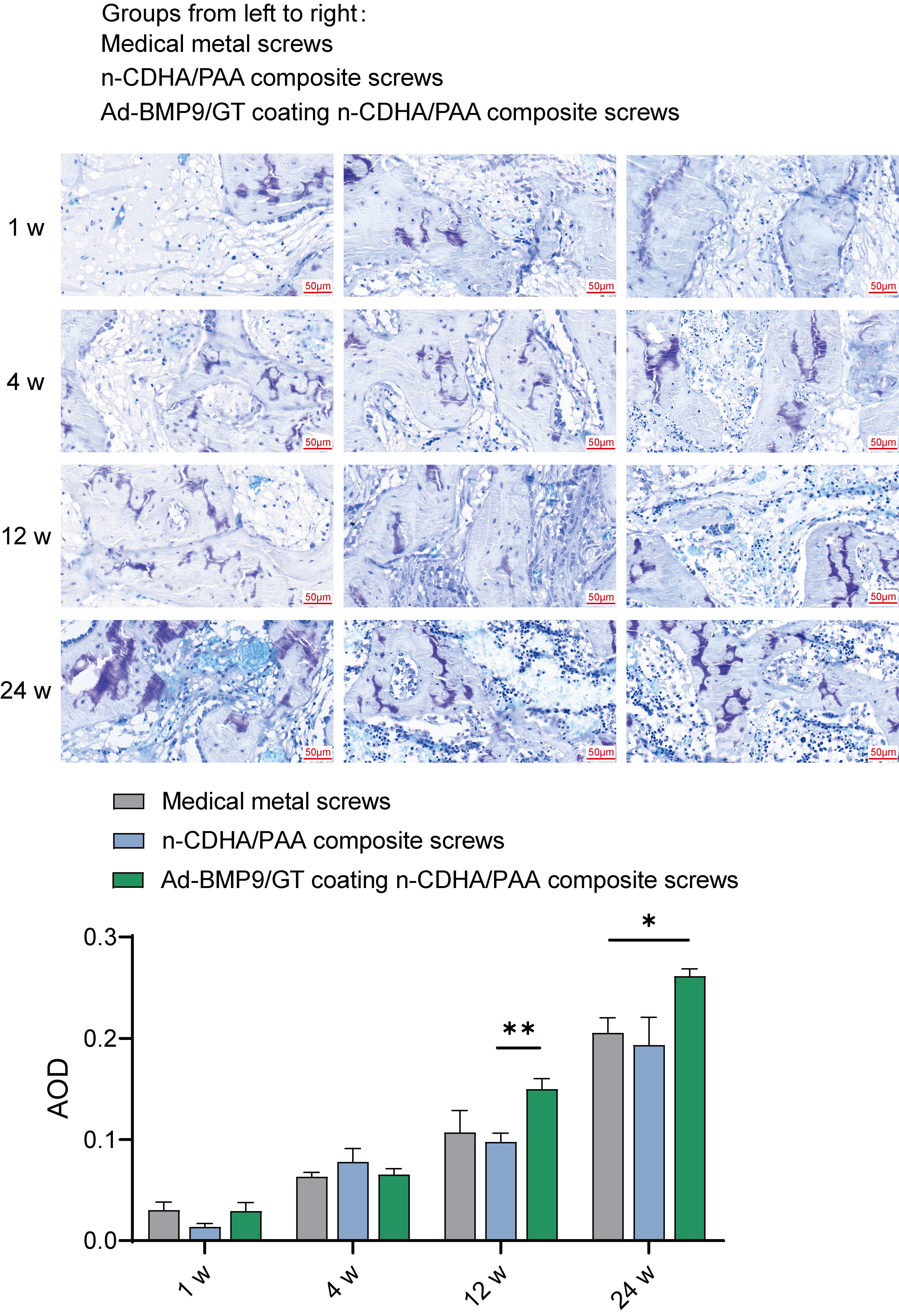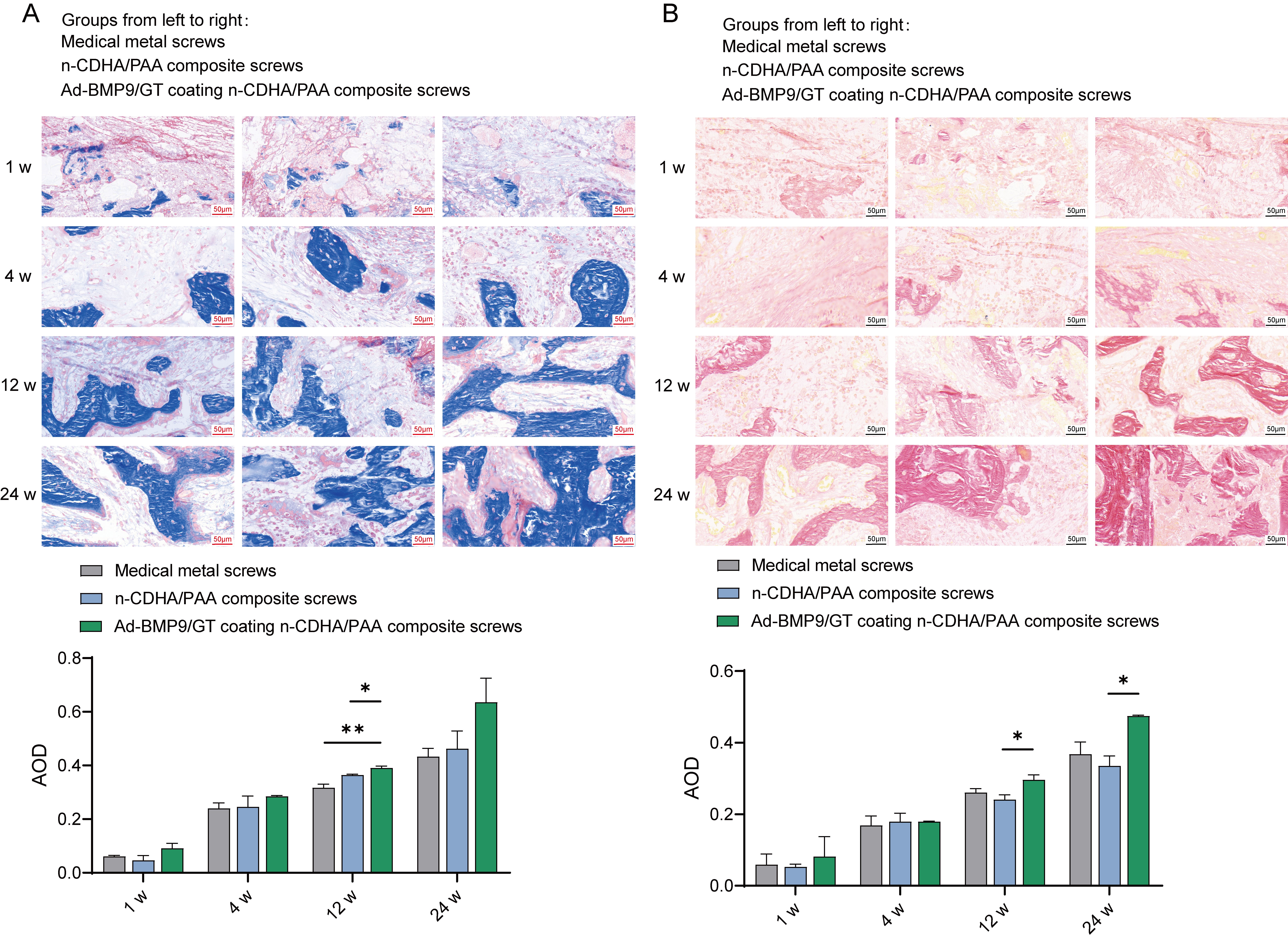 Ad-BMP-9/GT Coated n-CDHA/PAA composite screws group exhibited the most abundant growth of collagen fibers in the bone tissue (Fig. 7, p