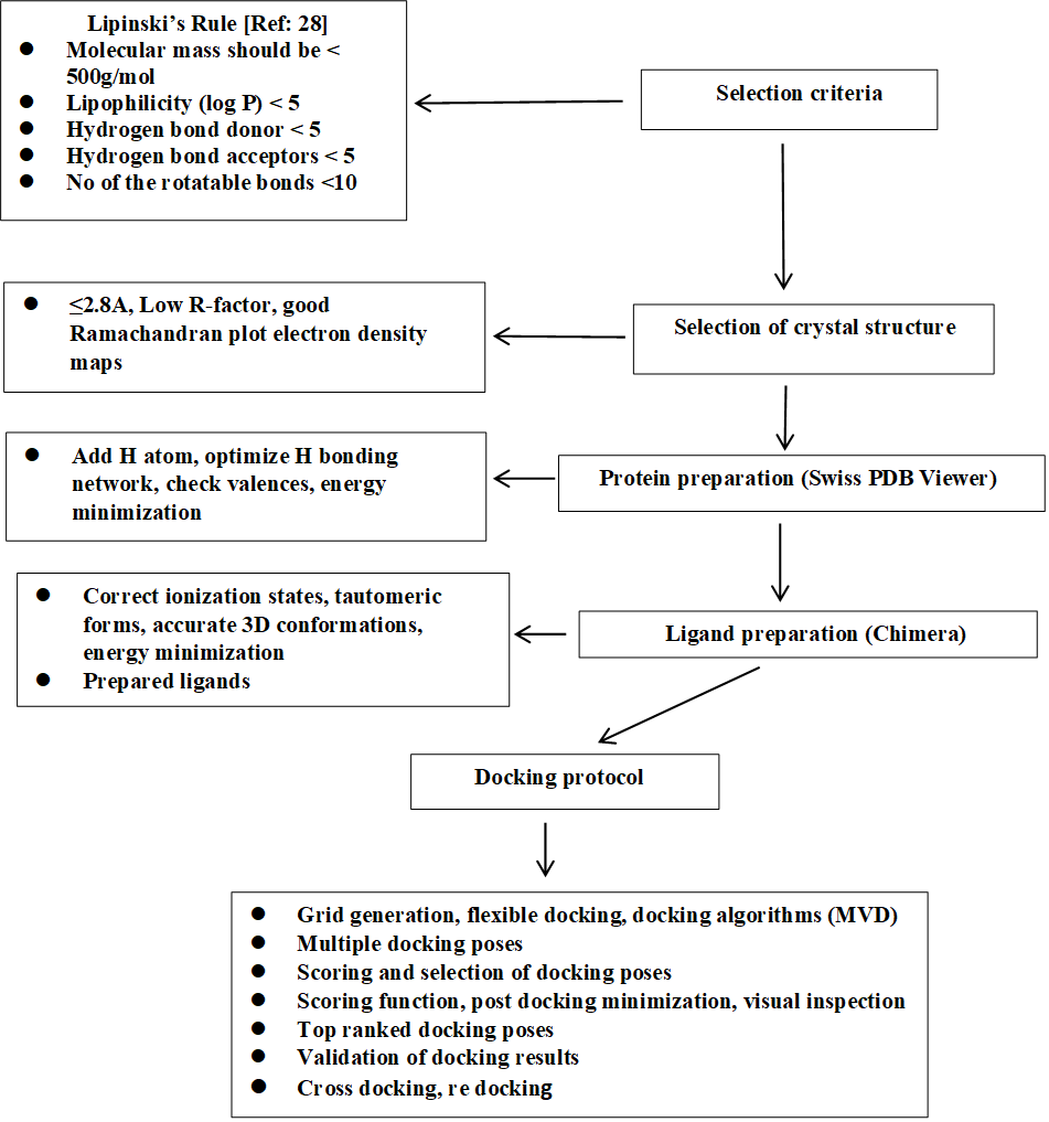 Scheme 1 (Ref. [28]) provides a flow chart of the docking procedure. Some docking details have already been described [26]. Additionally, the following details may be relevant in the light of the results obtained. The MolDock score is a negative score where lower scores indicate better binding affinities. The score combines various interaction terms to give an overall indication of the binding strength between the ligand and the protein. Positive docking scores generally indicate poor binding or unfavourable interactions within the binding site. This can occur due to significant steric hindrances between the ligand and the protein, unfavourable electrostatics, with repulsive electrostatic interactions outweighing attractive forces, and poor conformational fit, wherein the ligand cannot adopt a favourable conformation within the binding site. The docking results of ligands giving positive docking scores, despite being biologically active compounds, suggest that their specific conformations or functional groups are not well-suited for binding to the active site of the target protein in the modelled conditions.